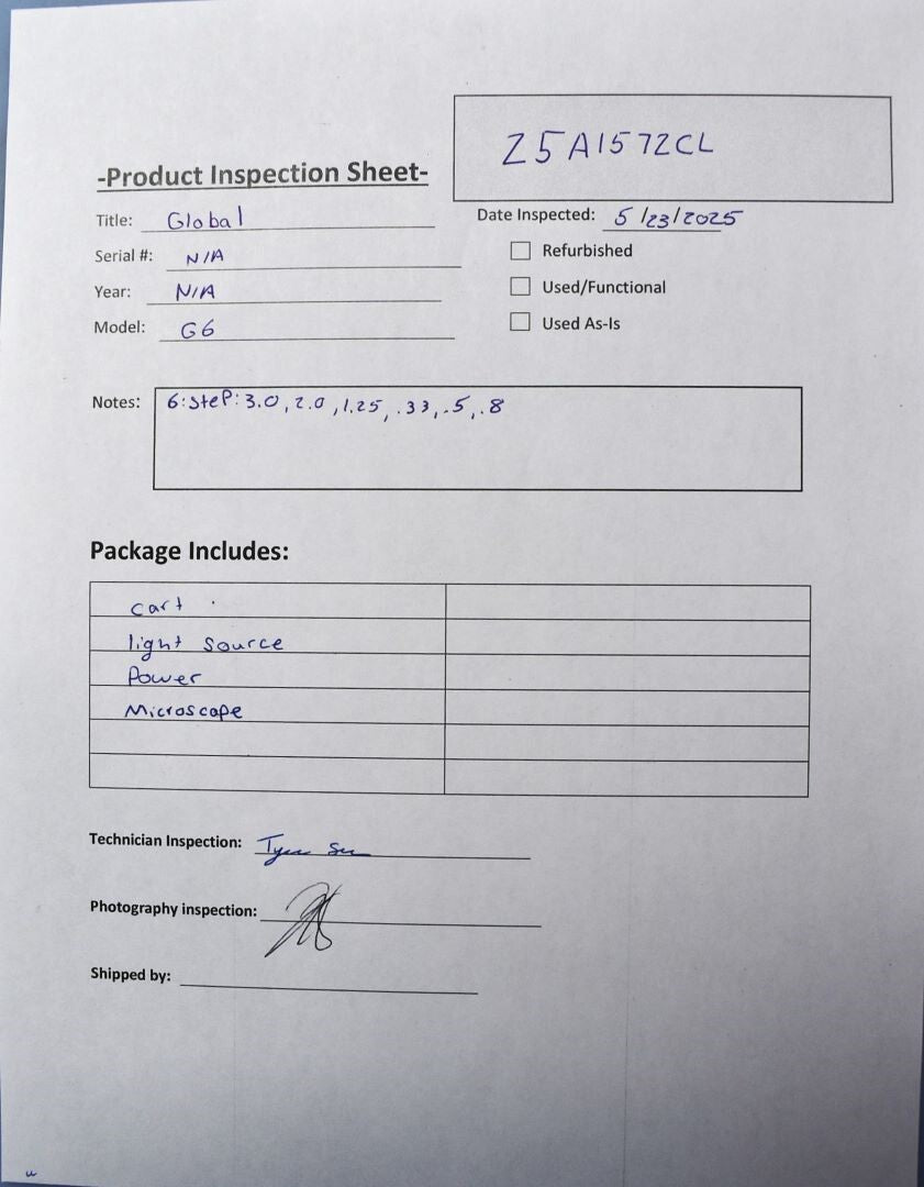 Your purchase will NOT include: This product is pre-owned and may not include the same accessories as a new, unused unit. - any other accessories not shown or listed here.I plugged this item in and turned the light source on. After that I simply put my hand under the lenses about 8 inches and got it focused. This unit is fully functional. The lenses are in good condition with no marks or scratches. Cosmetically this microscope is in good condition with some marks on the base but nothing serious. Test Results: Passed