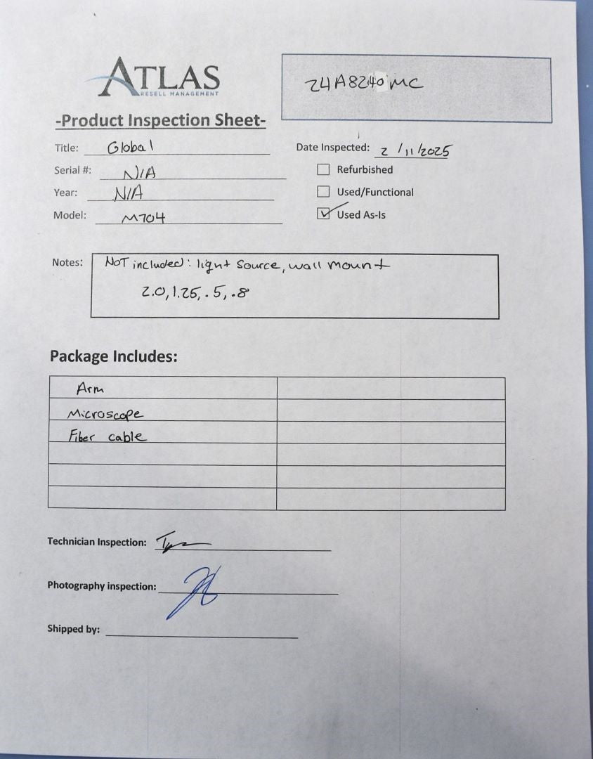 This set up is used as is because it is missing the light source, and the mount. This only has the arms, and microscope with the fiber running through the arms. I shined a flashlight through the fiber to make sure light passes through as intended. I also used a flashlight to shine through the fiber attachment of the microscope to make sure the light passes through there. The microscope is a 4 step system with 2.0 , 1.25 , .5 ,.8. The lenses look to be good and undamaged when viewing.