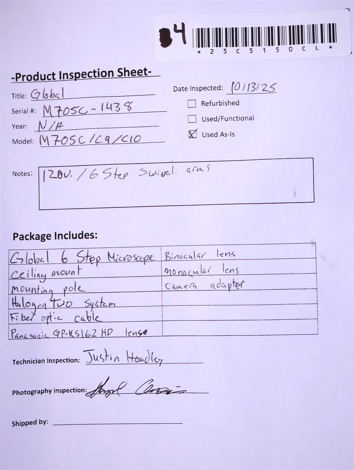 Global 6 Step Microscope, Ceiling Mount, Mounting Pole, HalogenTwo System, Fiber Optic Cable, Panasonic GP-KS5162HD Lens, Binocular Lens, Monocular Lens, Camera Adapter