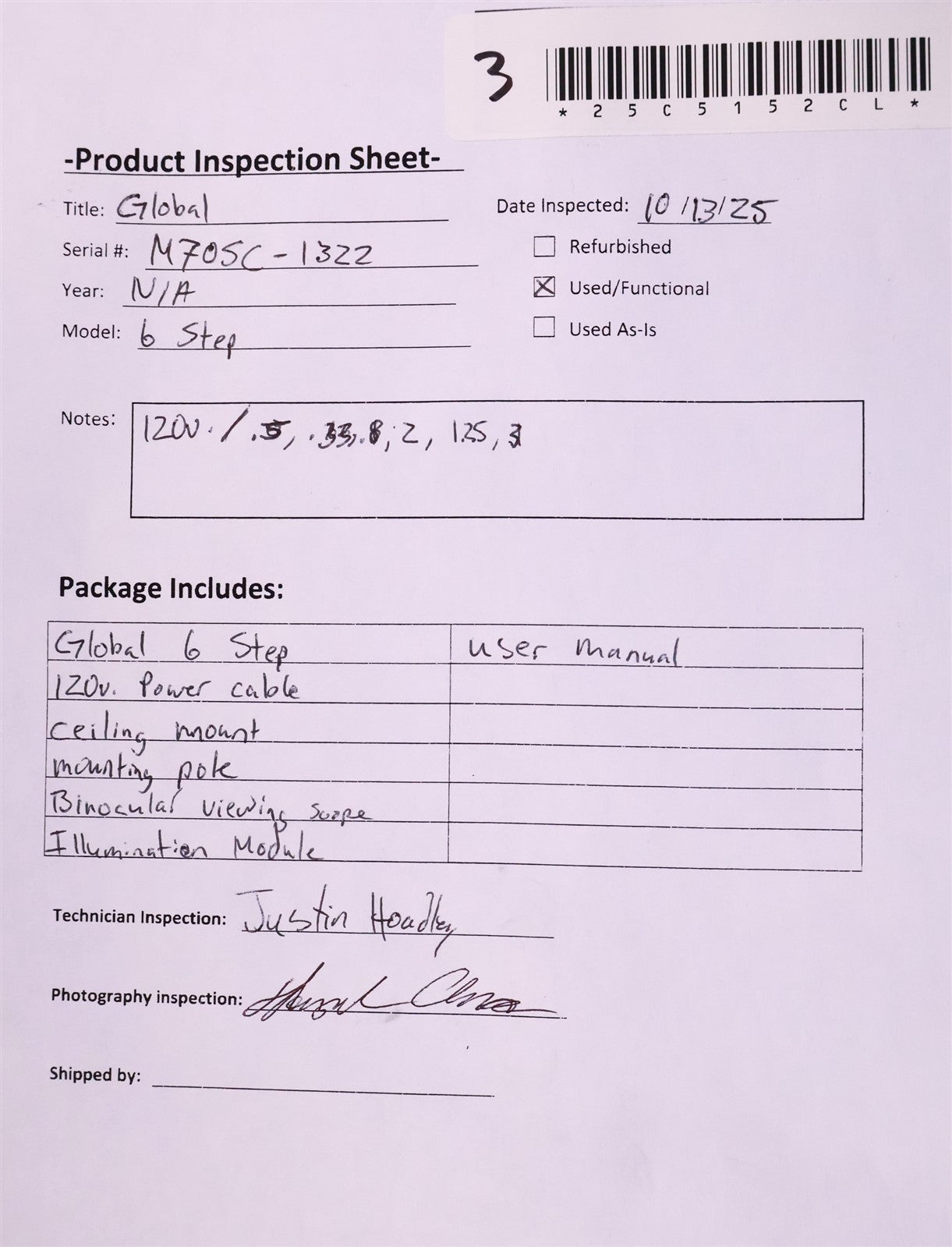 Global 6 Step, 120v Power Cable, Ceiling Mount, Mounting Pole, Binocular Viewing Scope, Illumination Module, User Manual