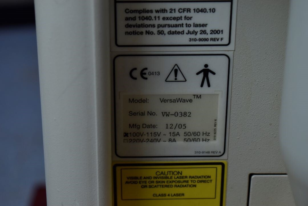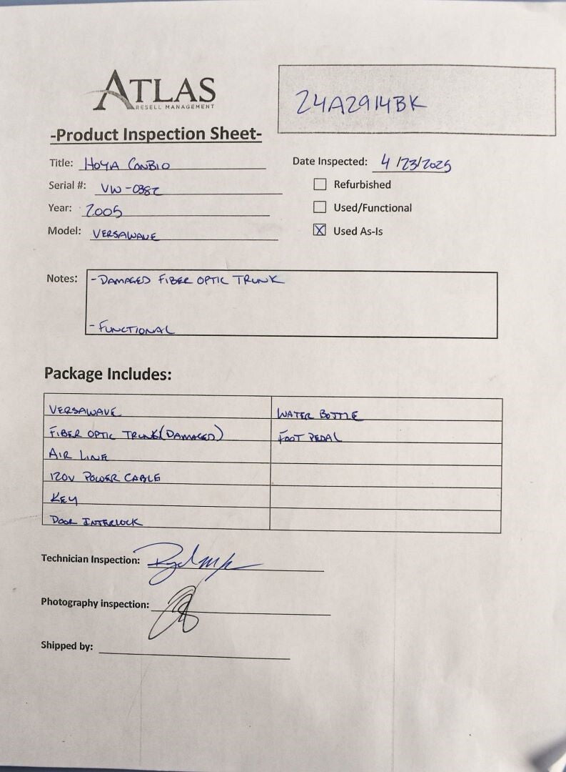 VersaWave, Fiber Optic Trunk (Damaged), Air Line, 120v Power Cable, Key, Door Interlock, Water Bottle, Foot Pedal