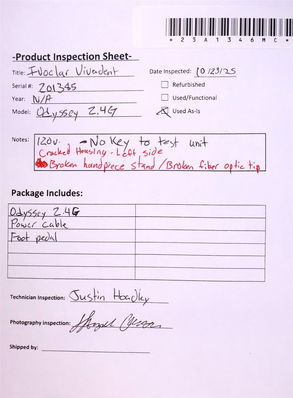 The unit underwent a visual inspection and appears to be in good physical condition. However, functionality could not be verified as the power key was not provided, preventing the unit from being powered on.