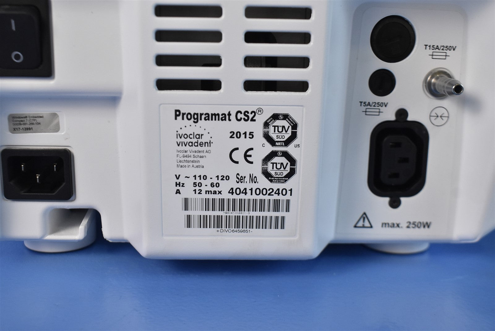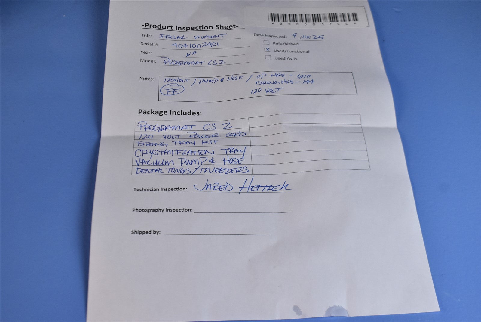 Ivoclar Vivadent Programat CS 2 ,was inspected for physical damage, functionality, and safety. The exterior housing is intact with no visible cracks or dents. The door seal is in good condition with no sings of wear. The unit powered on successfully, and the control panel is fully functional. Ran temperature test: Pass. , Dehumidification ,along with the test the unit indicated. Opened and closed door functionality :Pass. All controls are responsive. The unit has been cleaned and disinfected.Inspection Results: Passed- Ready for Resale