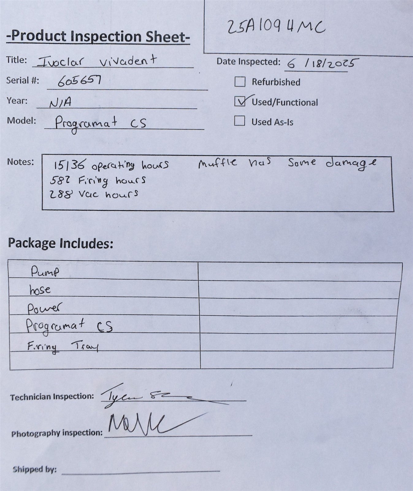 Your purchase will NOT include: This product is pre-owned and may not include the same accessories as a new, unused unit. - other accessories not shown or listed here.I set this item up correctly and ran the calibration cycle. This unit is fully functional and is in good cosmetic condition. This unit has 15136 operating hours, 582 firing hours and 288 vac hours.