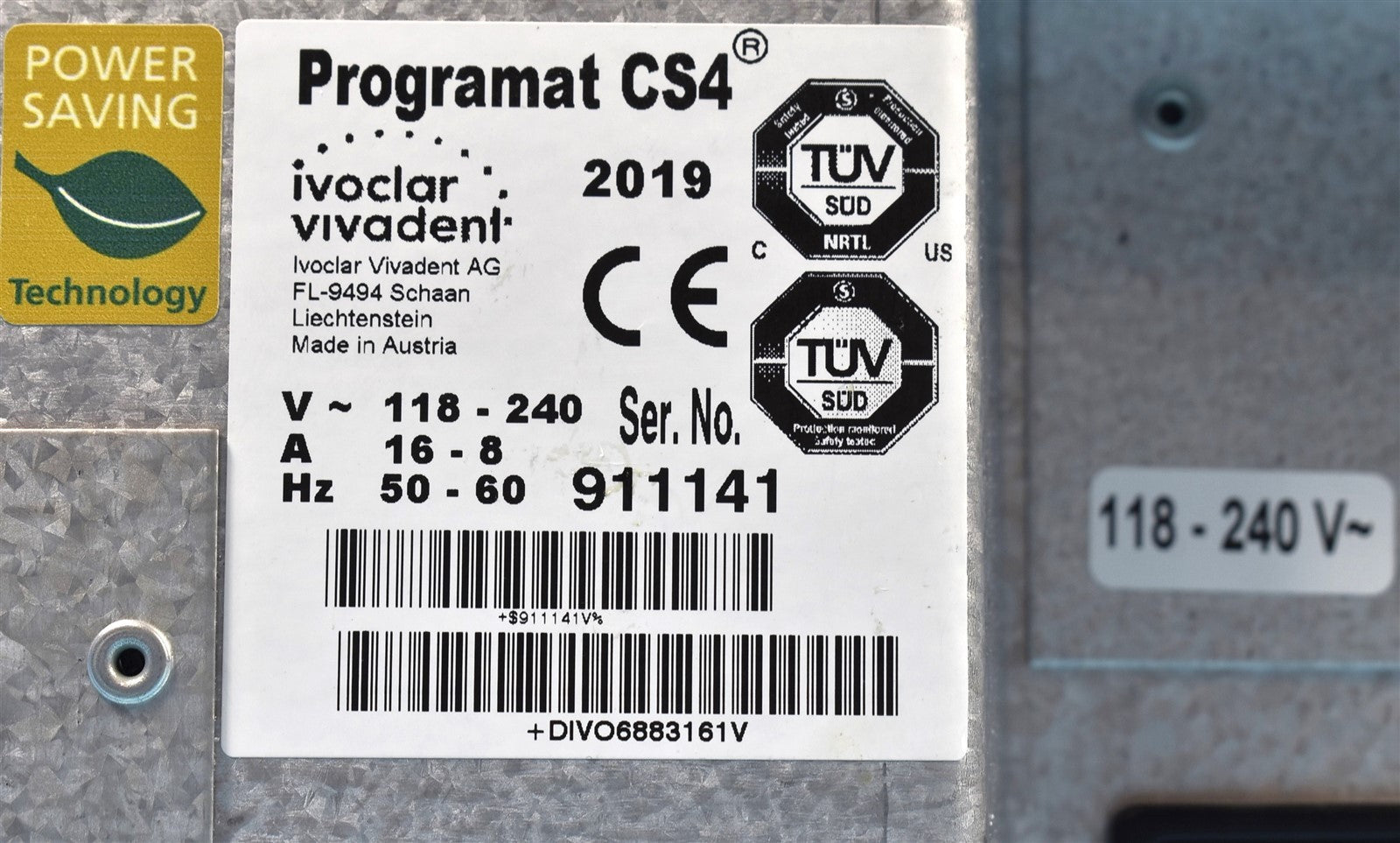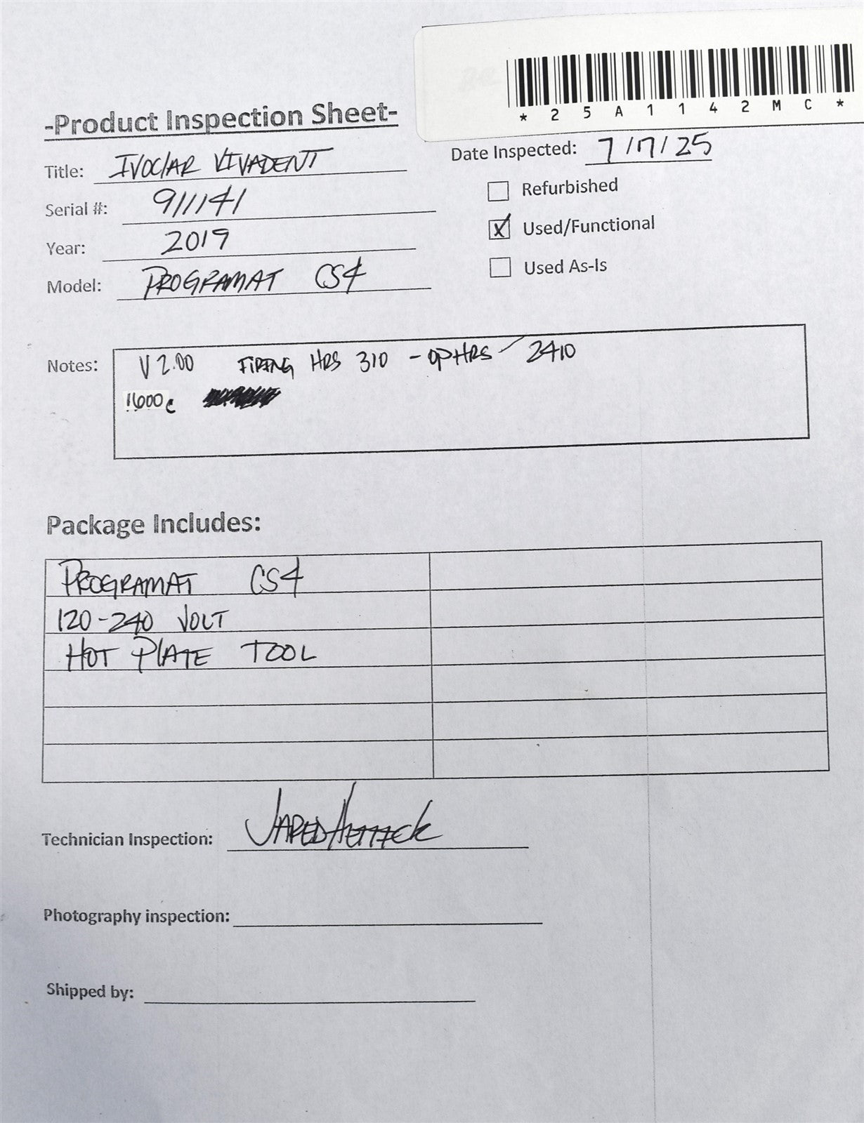 Ivoclar Vivadent Programat CS4 was inspected for physical damage, functionality, and safety. The exterior housing is intact with no visible cracks or dents. The door seal is in good condition with no sings of wear. The unit powered on successfully, and the control panel is fully functional. Ran temperature test: Pass. Ran calibration test, Dehumidification ,along with the test the unit indacated. Opened and closed door functionality:Pass. All controls are responsive. The unit has been cleaned and disinfected. Inspection Results: Passed- Ready for Resale