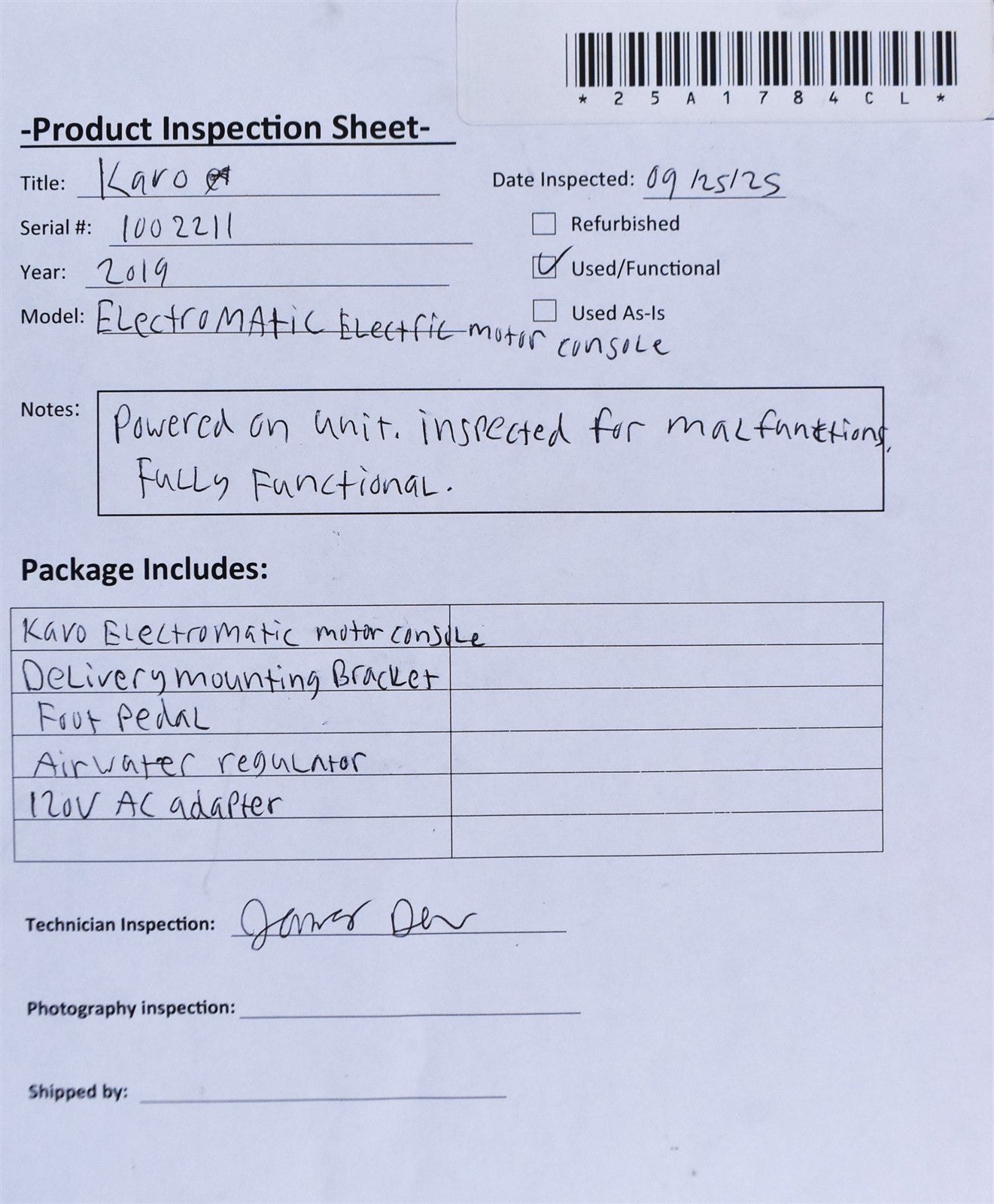 Powered on Unit. Inspected for malfunctions. Fully Functional.