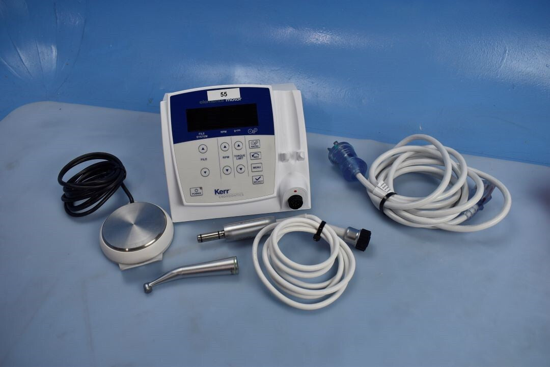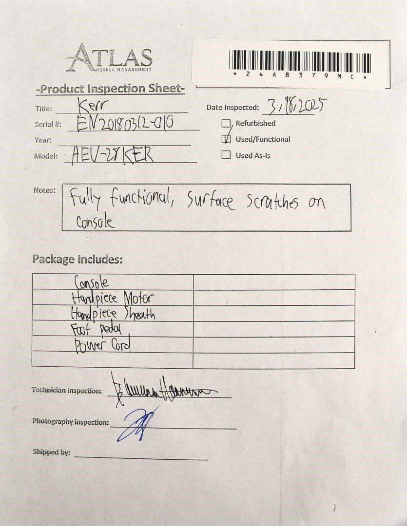 The Kerr AEU-28KER was inspected for motor functionality and overall condition. The handpiece runs at an appropriate power level and can be controlled with the console and foot pedal without issue. The overall condition is great with the only cosmetic issue being some small scratches on the surface of the console. Inspection Result: Passed - Ready for Resale