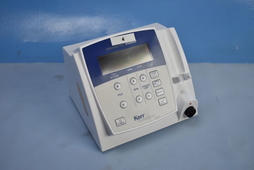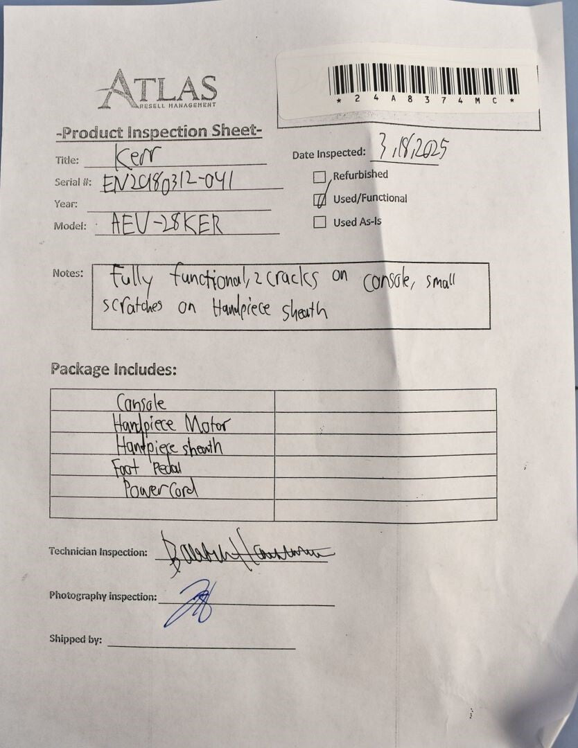 Your purchase will NOT include: N/AThis product is pre-owned and may not include the same accessories as a new, unused unit. - other accessories not shown or listed here.The Kerr AEU-28KER was inspected for its motor functionality and overall condition. The handpiece motors are fully functional and can be controlled with both the console and foot pedal without issue. The unit is in great condition with the only cosmetic issues being 2 small cracks on the console and some scratches on the handpiece sheath. Inspection Result: Passed - Ready for Resale