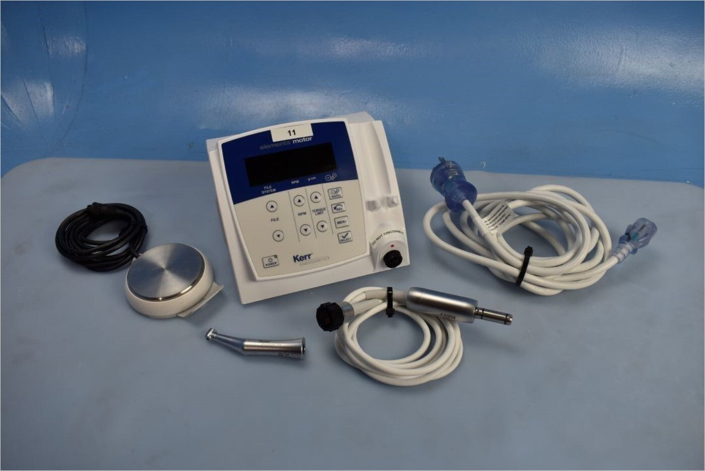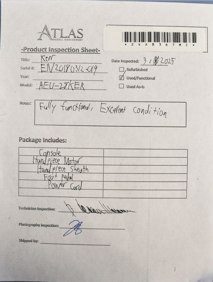 The Kerr AEU-28KER was inspected for its motor functionality and overall condition. The handpiece motors are fully functional and can be controlled with both the console and foot pedal without issue. The unit is in excellent condition without any damage and minimal cosmetic issues. Inspection Result: Passed - Ready for Resale