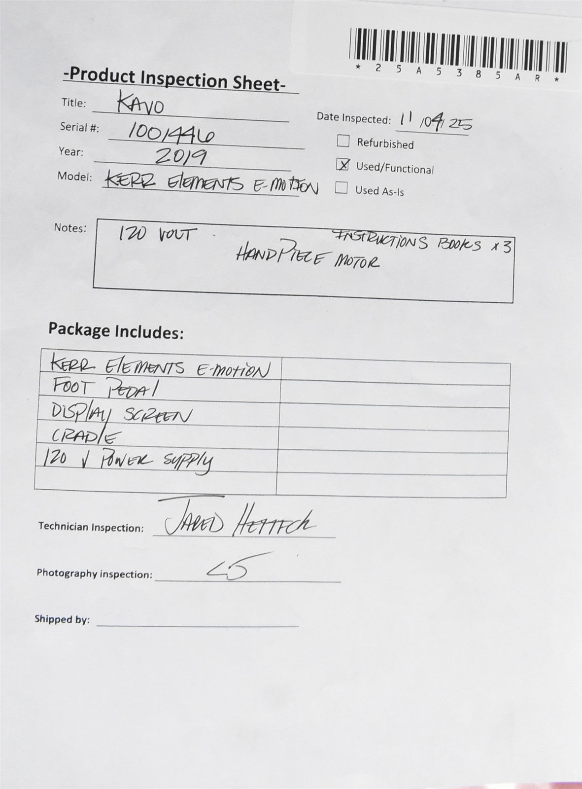 Visual Inspection: Examined the unit for any physical damage or manufacturing defects. Power Verification: Connected the unit to a 120V power source and confirmed proper power delivery. Functional Testing: Attached the handpiece and verified operation at both low and full power settings. Cleaning & Disinfection: Thoroughly cleaned and disinfected the unit in accordance with standard hygiene protocols. Final Assessment: Unit is fully functional and ready for resale.