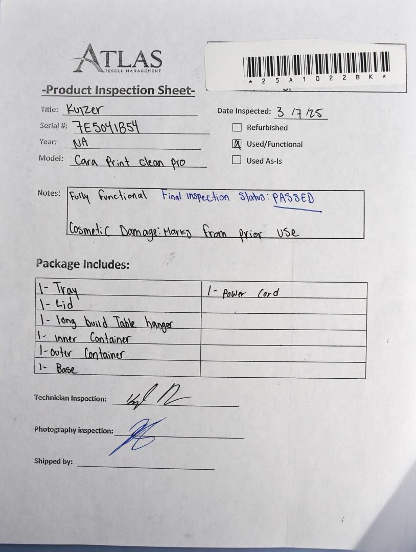 Prior to testing this unit, visually inspected for any damage. Unit is free of damage! Proceeded to attach to required power source, once unit was properly connected, unit powered on. Green light illuminated on keypad, Adjusted settings on keypad to ensure controls function. Started timer which then triggered unit to kick on. Due to not having a resin mold or any solution required for this unit, was unable to do a complete test. With what I was able to do, unit identified as FULLY FUNCTIONAL