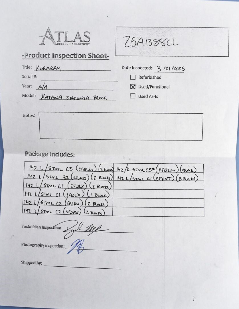 Atlas Resell Management has more experience testing and shipping CEREC and other CAD/CAM units than anyone else on eBay. Just check out the wide selection of CAD/CAM units in our store.We're proud to be the most trusted source for quality used CAD/CAM units in the pre-owned dental equipment market. Your purchase will NOT include: This product is pre-owned and may not include the same accessories as a new, unused unit. - other accessories not shown or listed here.Visually inspected the unit for any damaged or missing blocks. All blocks are in excellent condition.