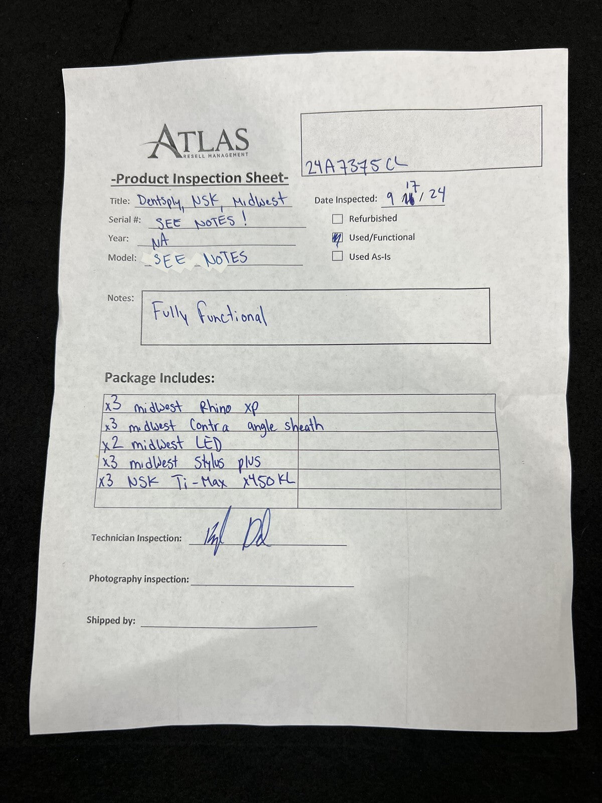 With this bundle of multiple handpieces, motors, and sheaths only the Midwest Stylus Plus SPK and NSK Ti-Max X450KL. All 6 of the testable handpieces respond when foot pedal is engaged triggering high-speed function. Due to not having required attachments for Rhino XP motor, Contra Angle Sheath, Midwest 6-Pin KS6-LED, Straight Nosecone Attachment I visually inspected to ensure damage free and in good condition. All 3 of the contra angle sheaths include head attachments. Both Led attachments are in GREAT condition. This bundle is free of any significant damage.