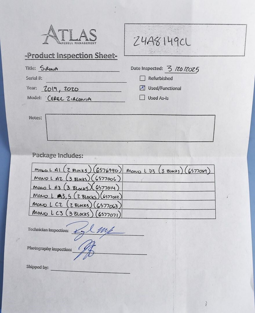 Atlas Resell Management has more experience testing and shipping CEREC and other CAD/CAM units than anyone else on eBay. Just check out the wide selection of CAD/CAM units in our store.We're proud to be the most trusted source for quality used CAD/CAM units in the pre-owned dental equipment market. Your purchase will NOT include: This product is pre-owned and may not include the same accessories as a new, unused unit. - other accessories not shown or listed here.Visually inspected the blocks for any damaged or chipped pieces. All blocks are in good condition.