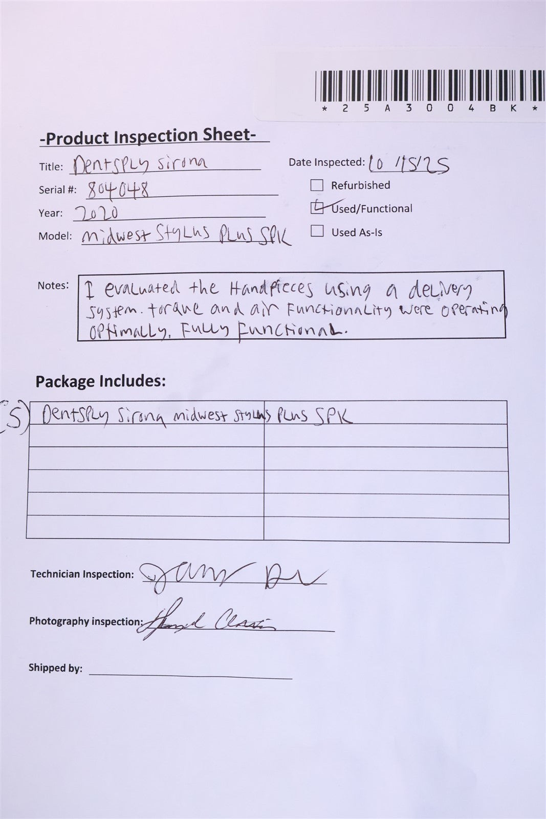Your purchase will NOT include: This product is pre-owned and may not include the same accessories as a new, unused unit. - other accessories not shown or listed here.I evaluated the Dentsply Sirona Midwest Stylus Plus SPK Handpieces Using a Standard Delivery System, confirming that both Torque and Air Functionality were Operating Optimally. Fully Functional.