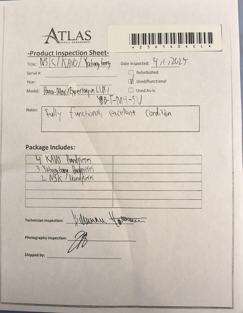 Your purchase will NOT include: N/AThis product is pre-owned and may not include the same accessories as a new, unused unit. - other accessories not shown or listed here.The handpieces were each inspected for their rotation and overall condition. Each handpieces rotated at an appropriate power level. The handpieces were each in excellent condition with very slight marks on their surface. Inspection Result: Passed - Ready for Resale