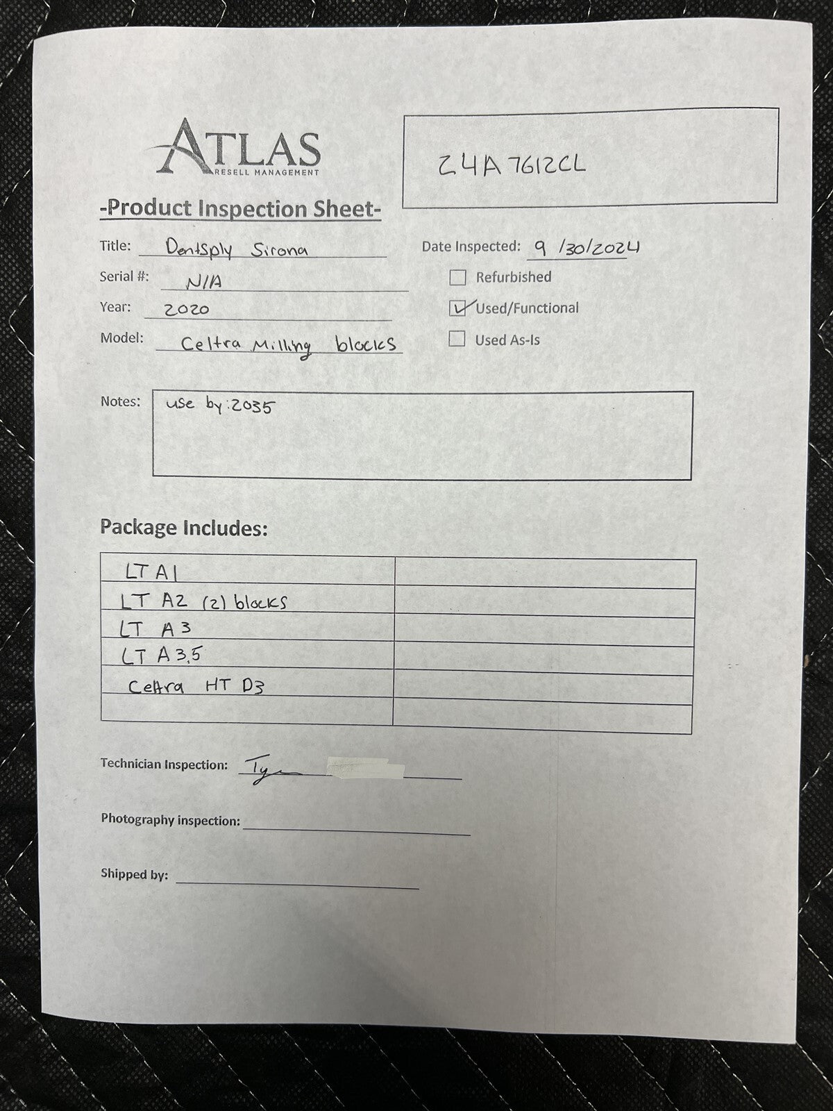 Atlas Resell Management has more experience testing and shipping CEREC and other CAD/CAM units than anyone else on eBay. Just check out the wide selection of CAD/CAM units in our store.We're proud to be the most trusted source for quality used CAD/CAM units in the pre-owned dental equipment market. Your purchase will NOT include: This product is pre-owned and may not include the same accessories as a new, unused unit. - other accessories not shown or listed here.Lot of 5 Used in Box: LT C14- A1, A2(2) blocks, A3, A3.5 // HT- D3