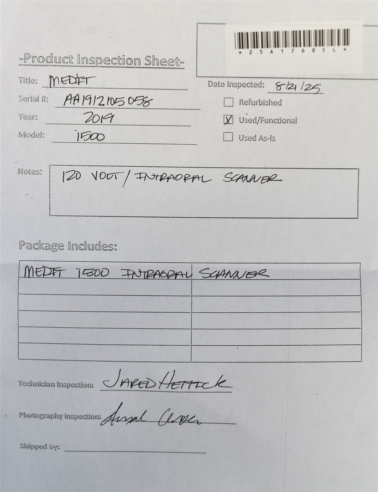 Atlas Resell Management has more experience testing and shipping CEREC and other CAD/CAM units than anyone else on eBay. Just check out the wide selection of CAD/CAM units in our store.We're proud to be the most trusted source for quality used CAD/CAM units in the pre-owned dental equipment market. Your purchase will NOT include:Power supplyThis product is pre-owned and may not include the same accessories as a new, unused unit. - other accessories not shown or listed here.Medit i500 Intraoral Scanner was powered on (USB) , Blue light came on. Fan is running. Inspection Result: - Ready for Resale.