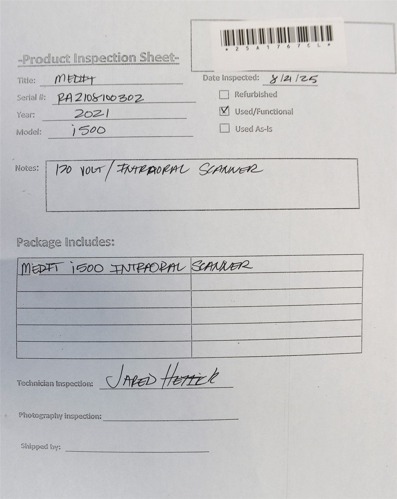 Atlas Resell Management has more experience testing and shipping CEREC and other CAD/CAM units than anyone else on eBay. Just check out the wide selection of CAD/CAM units in our store.We're proud to be the most trusted source for quality used CAD/CAM units in the pre-owned dental equipment market. Your purchase will NOT include:Power supply USB Cable SoftwareThis product is pre-owned and may not include the same accessories as a new, unused unit. - other accessories not shown or listed here.Medit i500 Intraoral Scanner was powered on (USB) , Blue light came on. Fan is running. Inspection Result: - Ready for Resale.