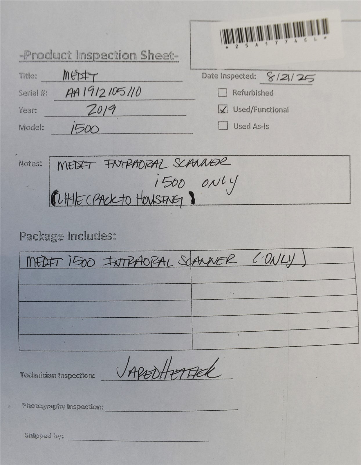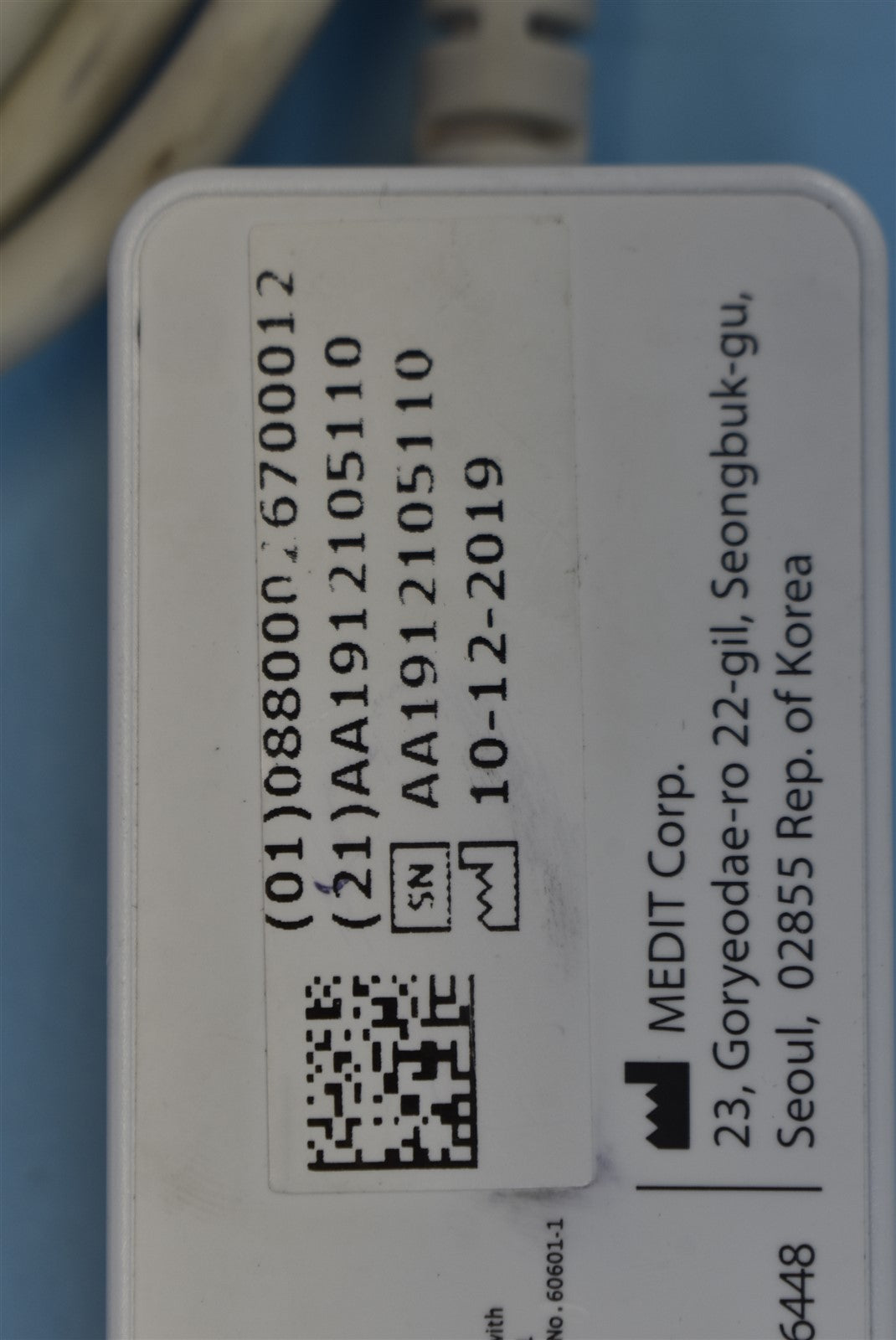 Medit i500 Intra Oral Scanner was powered on (USB) , Blue light came on. Fan is running. Inspection Result: - Ready for Resale.
