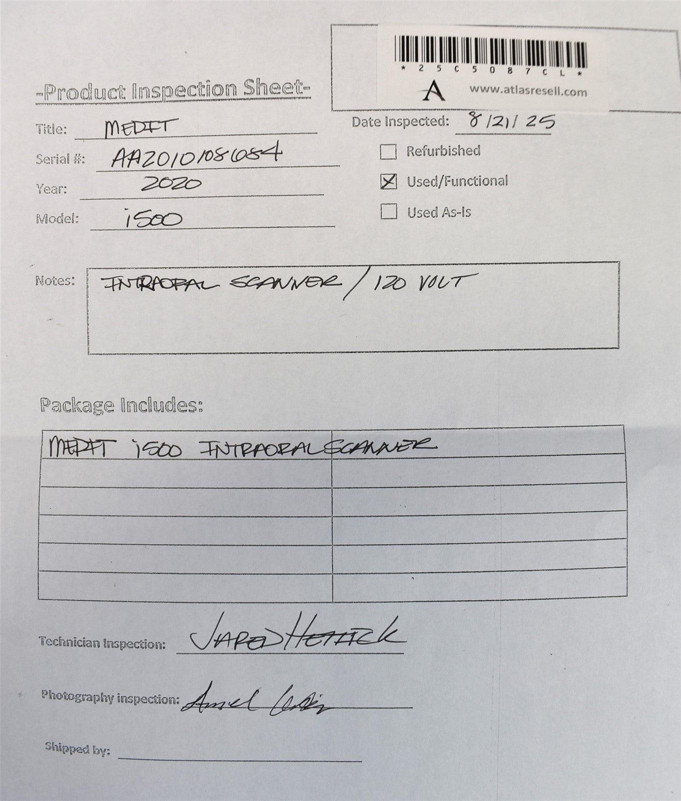 Atlas Resell Management has more experience testing and shipping CEREC and other CAD/CAM units than anyone else on eBay. Just check out the wide selection of CAD/CAM units in our store.We're proud to be the most trusted source for quality used CAD/CAM units in the pre-owned dental equipment market. Your purchase will NOT include:Power supplyThis product is pre-owned and may not include the same accessories as a new, unused unit. - other accessories not shown or listed here.Medit i500 Intraoral Scanner was powered on (USB) , Blue light came on. Fan is running. Inspection Result: - Ready for Resale.