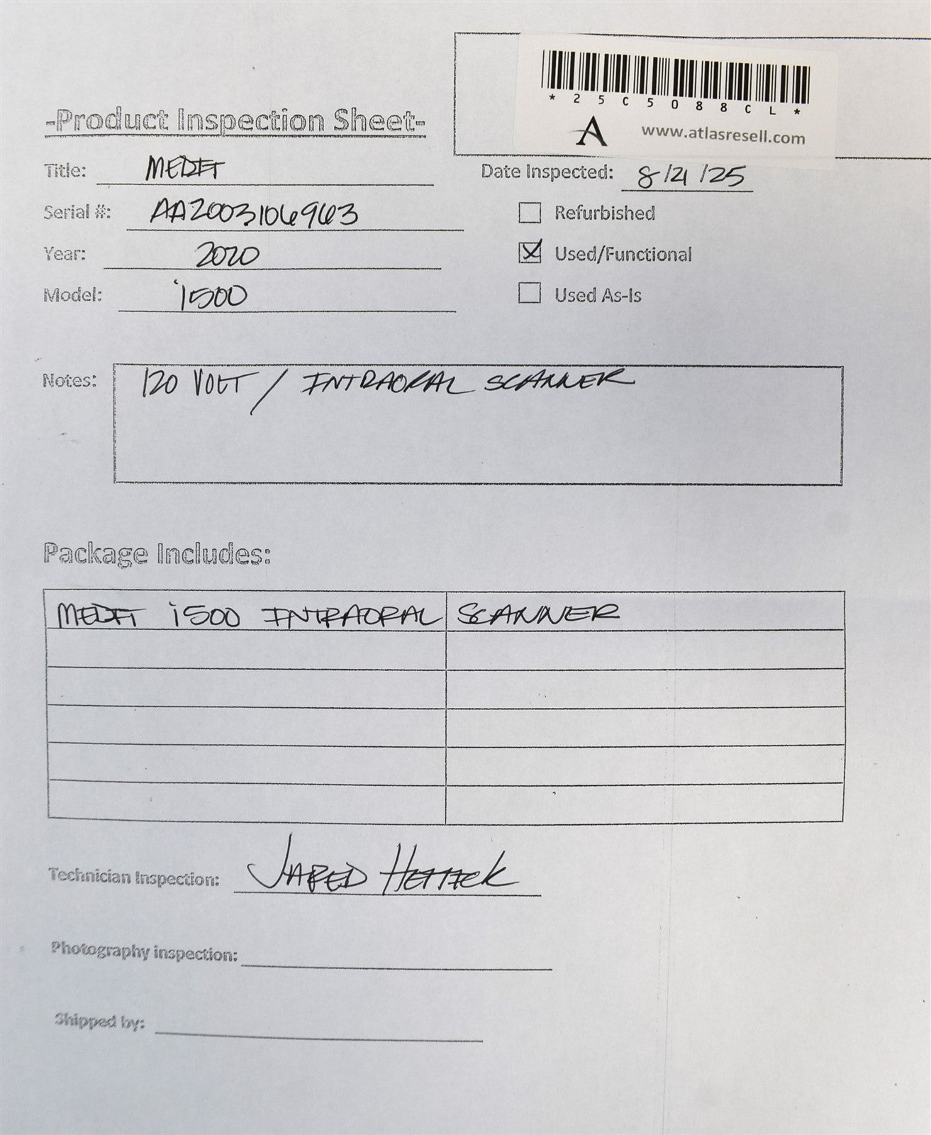 Medit i500 Intraoral Scanner was powered on (USB) , Blue light came on. Fan is running. Inspection Result: - Ready for Resale.