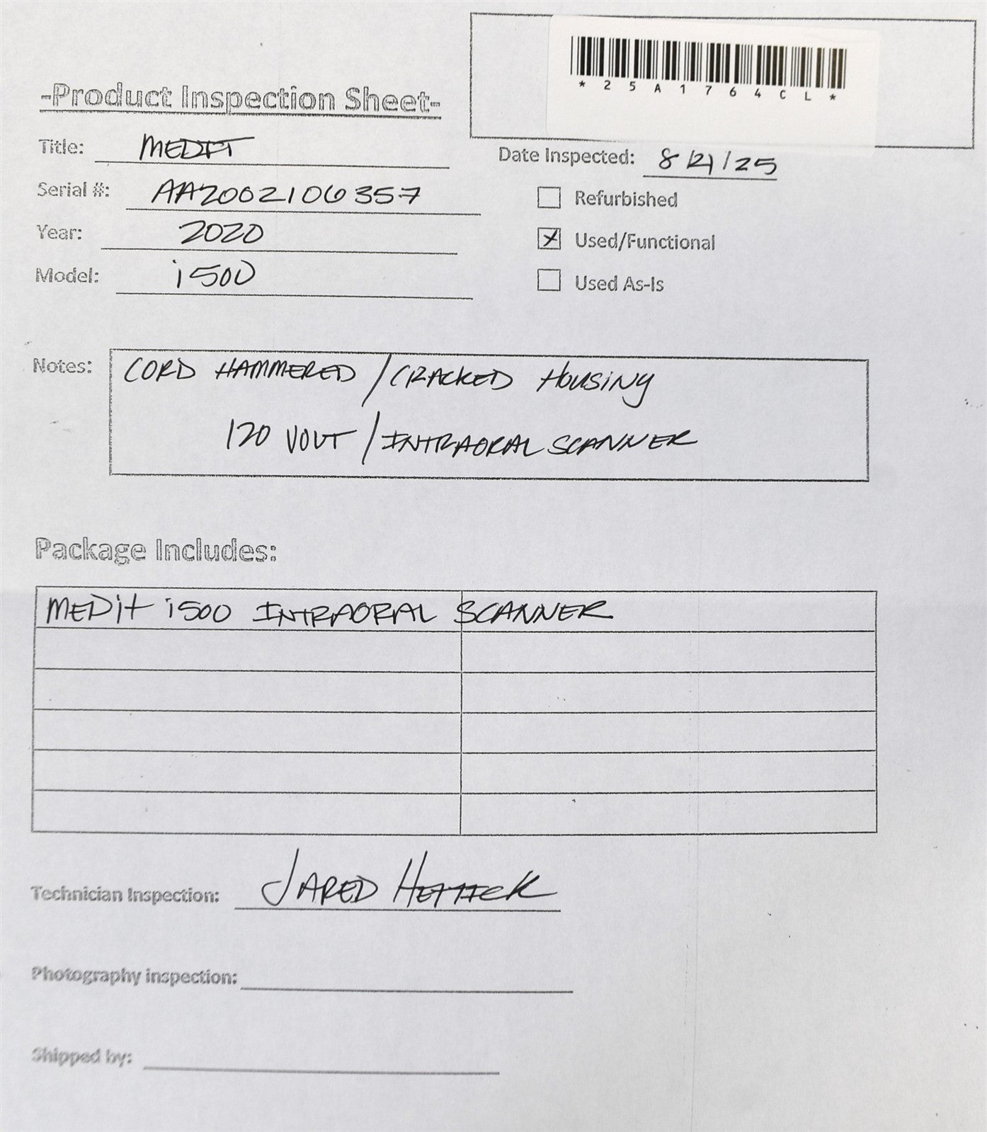 Atlas Resell Management has more experience testing and shipping CEREC and other CAD/CAM units than anyone else on eBay. Just check out the wide selection of CAD/CAM units in our store.We're proud to be the most trusted source for quality used CAD/CAM units in the pre-owned dental equipment market. Your purchase will NOT include:Power supplyThis product is pre-owned and may not include the same accessories as a new, unused unit. - other accessories not shown or listed here. Medit i500 Intraoral Scanner High-speed scanning at ~35 frames per second Accurate scanning: up to 21 µm ± 1.48 µm (high precision) Dual-camera system with LED imaging for HD full-color capture Triangulation technology for reliable 3D imaging with minimal moving parts Powderless operation for enhanced patient comfort Ergonomic, lightweight design (~280 g) with small tip for easy intraoral access Single-button control for intuitive scan start-stop functions Open architecture: exports STL, OBJ, and PLY formats; seamless Medit Link integration Removable & autoclavable tips—cross-infection control (up to ~50 cycles) No subscription fees; cost-effective entry-level solution