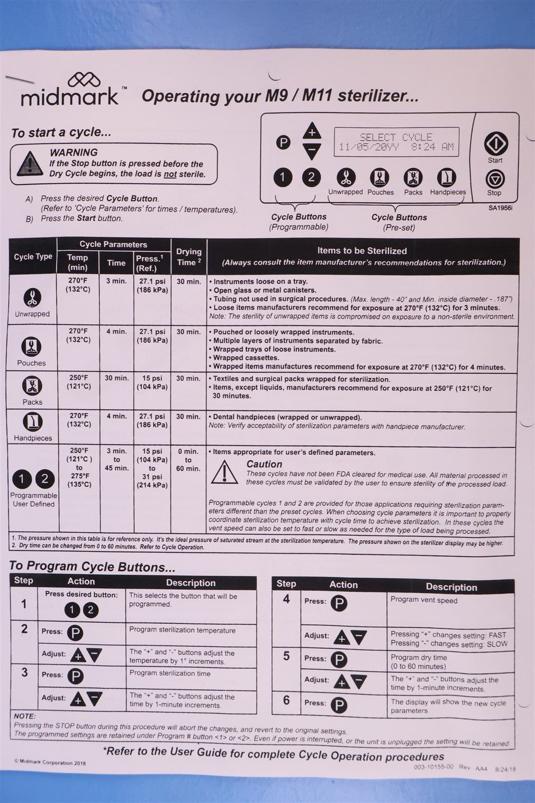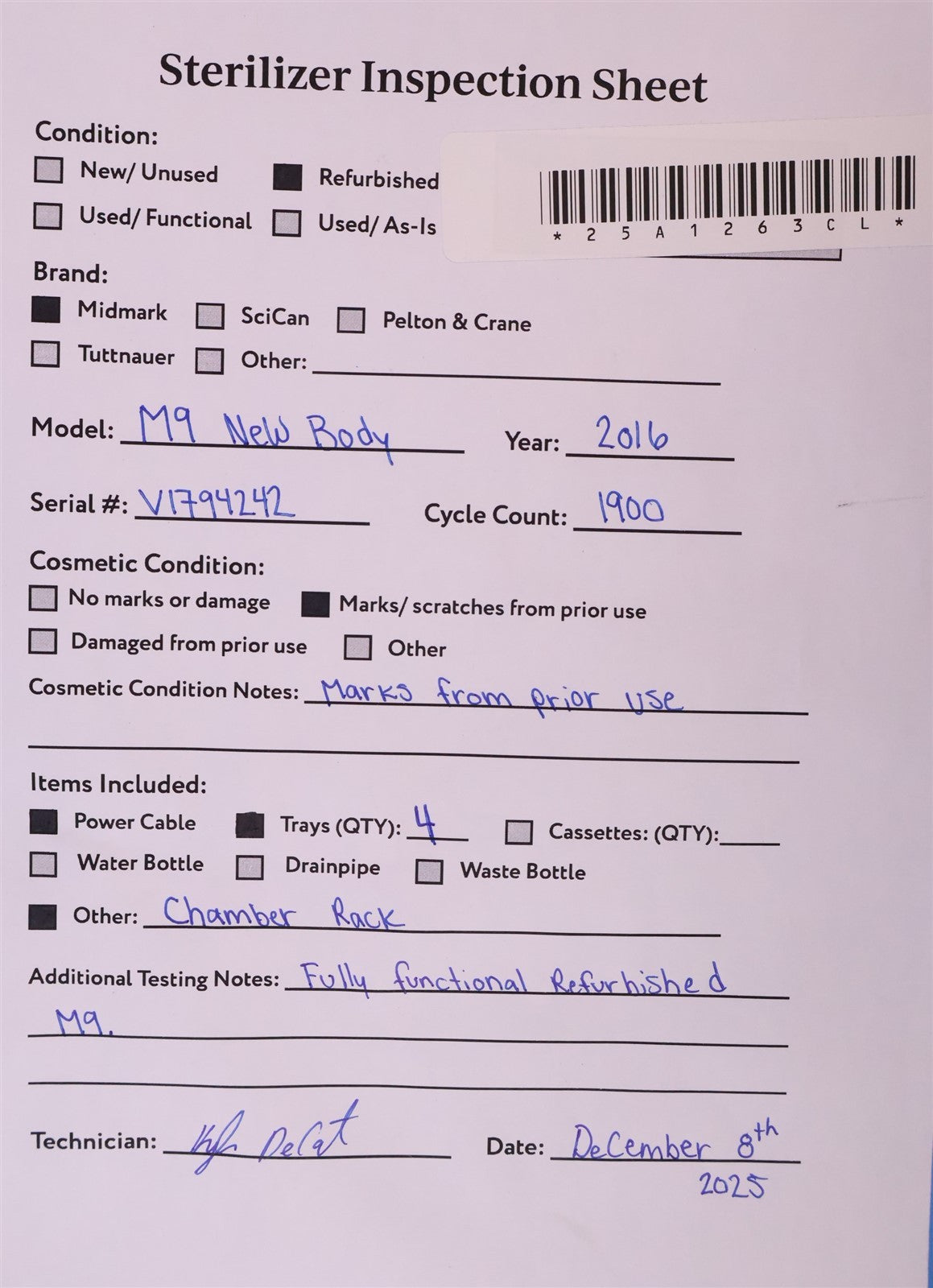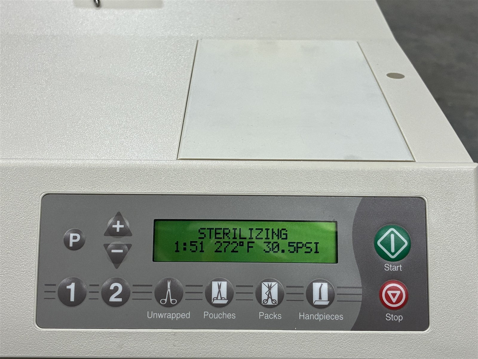 Prior to testing this autoclave, it was disassembled down to the bare chassis, cleaned, rebuilt and refurbished. Removed and rebuilt the Door Latch assembly. Cleaned Reservoir Tank and installed a new Drain Hose and Condenser Coil. Installed a new Fill / Vent Valve Manifold Assembly and Air Valve Solenoid. Installed a new Door Gasket, Dam Gasket, Heating Element, and Mesh Water Filters. Installed a new Keypad. Cleaned the Sterilizing Trays and Rack. Then proceeded to test the sterilizer. Connected it to a 120 volt power source, added distilled water and ran the autoclave through all it's preset sterilizing and drying cycles. To verify that this autoclave is achieving it's required maximum sterilizing temperature, it was temperature tested using a Max Register Thermometer, and found to reach 273 F for an entire cycle.