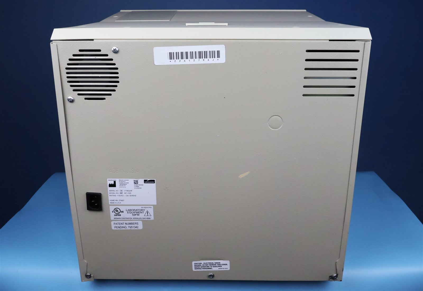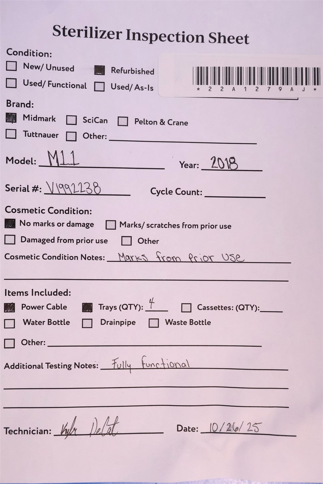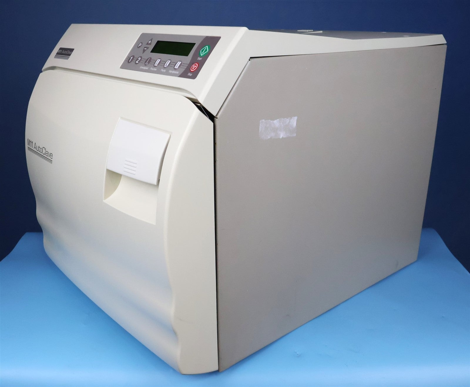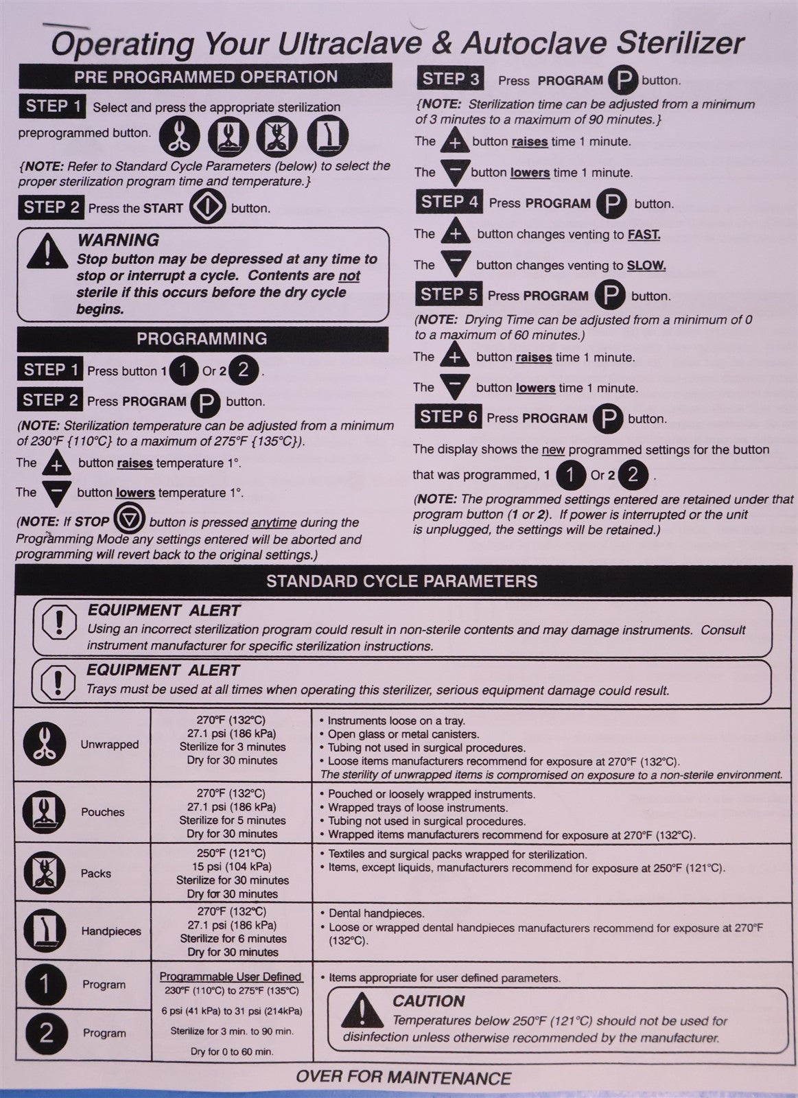 Prior to testing this autoclave, it was disassembled down to the bare chassis, cleaned, rebuilt and refurbished. Removed and rebuilt the Door Latch assembly. Cleaned Reservoir Tank and installed a new Drain Hose and Condenser Coil. Installed a new Fill / Vent Valve Manifold Assembly and Air Valve Solenoid. Installed a new Door Gasket, Dam Gasket, Heating Element, and Mesh Water Filters. Installed a new Keypad. Cleaned the Sterilizing Trays and Rack. Then proceeded to test the sterilizer. Connected it to a 120 volt power source, added distilled water and ran the autoclave through all it's preset sterilizing and drying cycles. To verify that this autoclave is achieving it's required maximum sterilizing temperature, it was temperature tested using a Max Register Thermometer, and found to reach 273 F for an entire cycle