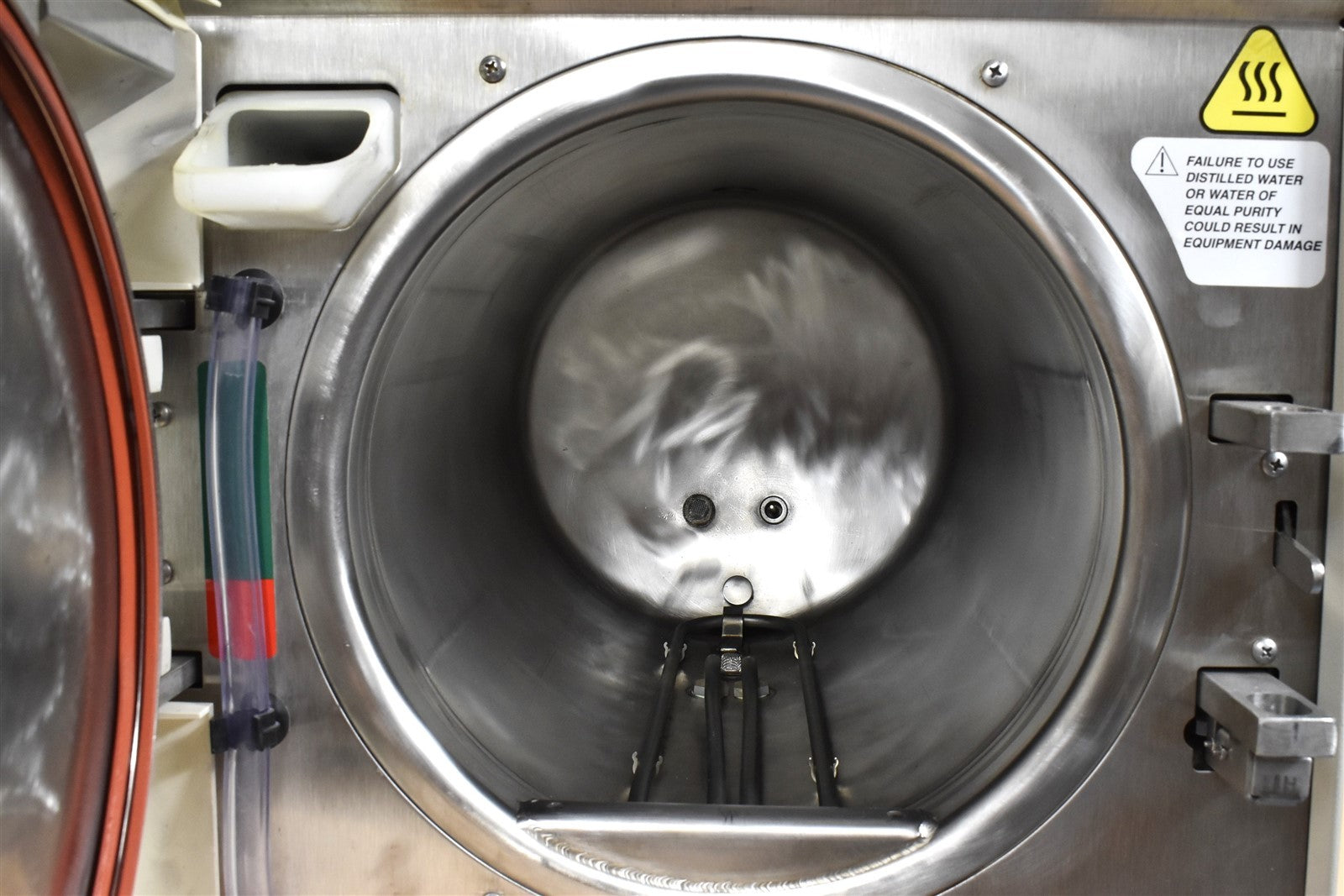 Prior to testing this autoclave, it was disassembled down to the bare chassis, cleaned, rebuilt and refurbished. Removed and rebuilt the Door Latch assembly. Cleaned Reservoir Tank and installed a new Drain Hose and Condenser Coil. Installed a new Fill / Vent Valve Manifold Assembly and Air Valve Solenoid. Installed a new Door Gasket, Dam Gasket, Heating Element, and Mesh Water Filters. Installed a new Keypad. Cleaned the Sterilizing Trays and Rack. Then proceeded to test the sterilizer. Connected it to a 120 volt power source, added distilled water and ran the autoclave through all it's preset sterilizing and drying cycles. To verify that this autoclave is achieving it's required maximum sterilizing temperature, it was temperature tested using a Max Register Thermometer, and found to reach 273 F for an entire cycle.