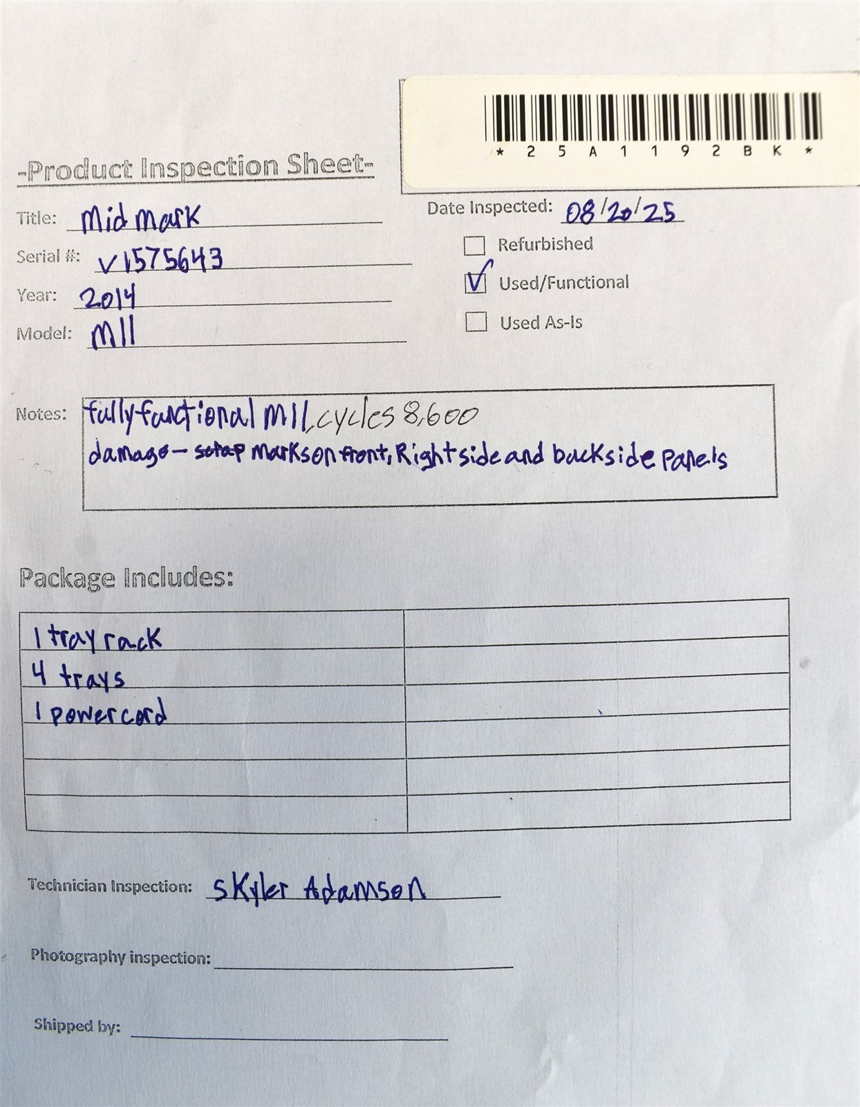 Your purchase will NOT include: - other accessories not shown or listed here. Midmark M11 Steam Autoclave Efficient sterilization cycles for dental instruments Automatic water refill and drainage for convenience Large chamber accommodates multiple instruments or cassettes User-friendly interface with cycle monitoring and alerts Compact design suitable for operatories and labs Durable construction for long-term reliability Validated sterilization performance for clinical safety Energy-efficient operation for reduced utility costs Trusted Midmark engineering and customer supportM11 NEW BODY Prior to testing this autoclave, it was disassembled down to the bare chassis, cleaned, rebuilt and refurbished. Removed and rebuilt the Door Latch assembly. Cleaned Reservoir Tank and installed a new Drain Hose and Condenser Coil. Installed a new Fill / Vent Valve Manifold Assembly and Air Valve Solenoid. Installed a new Door Gasket, Dam Gasket, Heating Element, and Mesh Water Filters. Installed a new Keypad. Cleaned the Sterilizing Trays and Rack. Then proceeded to test the sterilizer. Connected it to a 120 volt power source, added distilled water and ran the autoclave through all it's preset sterilizing and drying cycles. To verify that this autoclave is achieving it's required maximum sterilizing temperature, it was temperature tested using a Max Register Thermometer, and found to reach 273 F for an entire cycle.