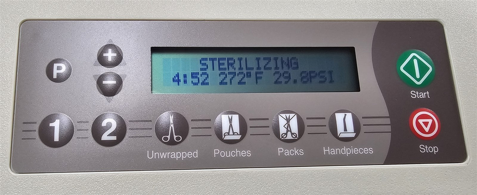 Prior to testing this autoclave, it was disassembled down to the bare chassis, cleaned, rebuilt and refurbished. The Door Latch assembly was disassembled, cleaned and rebuilt, and was tested to insure proper opening of the chamber door during the dry cycle. Installed a new Reservoir Tank, Drain Hose and Condenser Coil. Installed a new Fill / Vent Valve Manifold Assembly and Air Valve Solenoid. Installed a new Door Panel, Door Gasket, Dam Gasket, Heating Element, and Mesh Water Filters. Installed a new Safety Valve, Top Panel, LCD Display and Keypad. Cleaned the Sterilizing Trays and Rack. Then proceeded to test the sterilizer. Connected it to a 120 volt power source, added distilled water and ran the autoclave through all it's preset sterilizing and drying cycles. To verify that this autoclave is achieving it's required maximum sterilizing temperature, it was temperature tested using a Max Register Thermometer, and found to reach 273 F for an entire cycle.