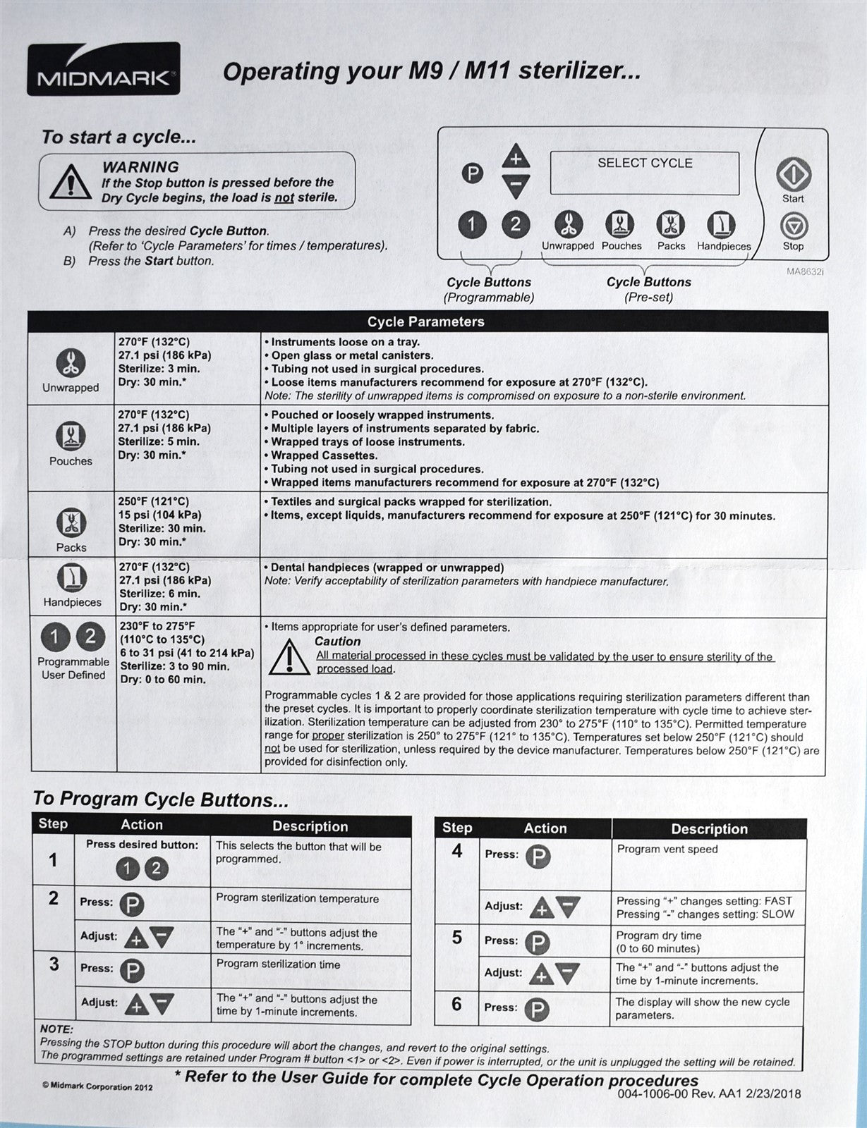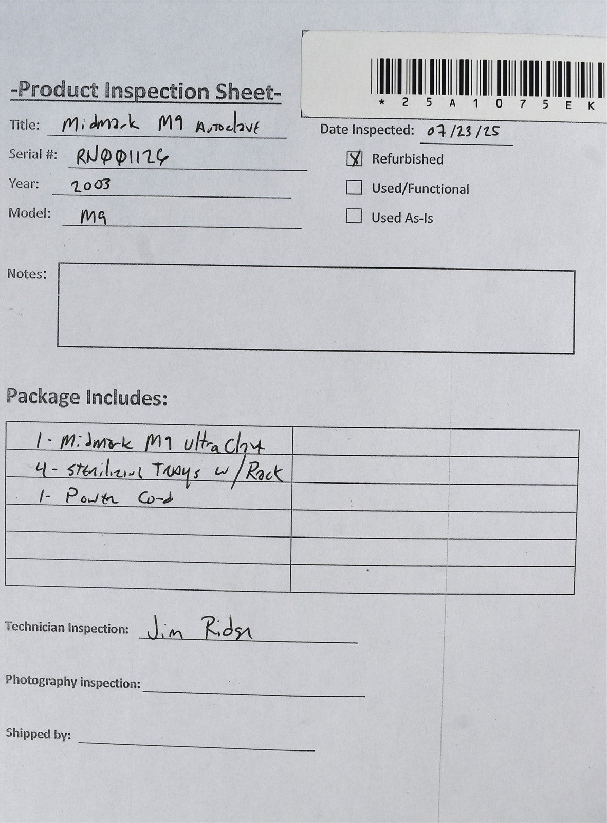 1 - Refurbished Midmark M9 Autoclave 4 - Sterilizing Trays w/ Rack 1 - Power Cord
