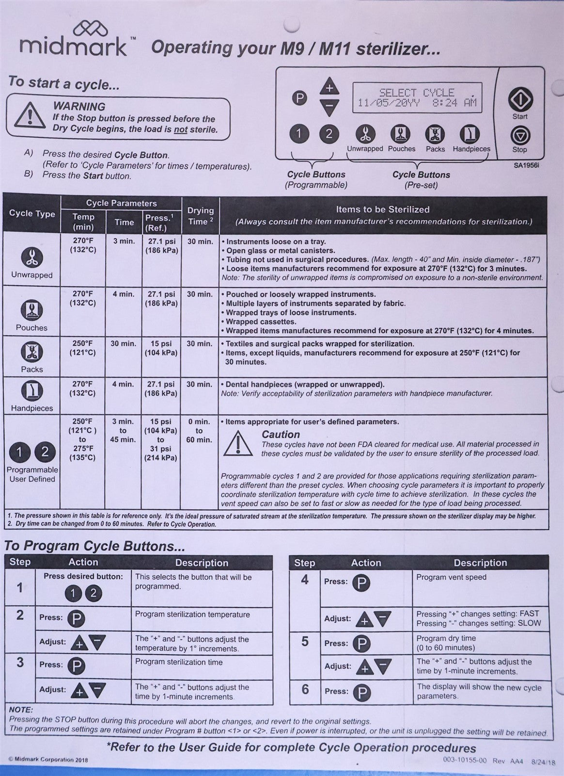M9 NEW BODY Prior to testing this autoclave, it was disassembled down to the bare chassis, cleaned, rebuilt and refurbished. Removed and rebuilt the Door Latch assembly. Cleaned Reservoir Tank and installed a new Drain Hose and Condenser Coil. Installed a new Fill / Vent Valve Manifold Assembly and Air Valve Solenoid. Installed a new Door Gasket, Dam Gasket, Heating Element, and Mesh Water Filters. Installed a new Keypad. Cleaned the Sterilizing Trays and Rack. Then proceeded to test the sterilizer. Connected it to a 120 volt power source, added distilled water and ran the autoclave through all it's preset sterilizing and drying cycles. To verify that this autoclave is achieving it's required maximum sterilizing temperature, it was temperature tested using a Max Register Thermometer, and found to reach 273 F for an entire cycle.