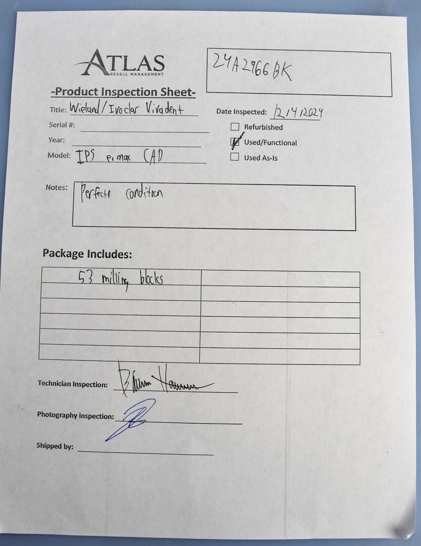 Atlas Resell Management has more experience testing and shipping CEREC and other CAD/CAM units than anyone else on eBay. Just check out the wide selection of CAD/CAM units in our store.We're proud to be the most trusted source for quality used CAD/CAM units in the pre-owned dental equipment market. Your purchase will NOT include: This product is pre-owned and may not include the same accessories as a new, unused unit. - other accessories not shown or listed here.Did a visual inspection and took stock of the unit. Each block is present and in perfect condition. -BH
