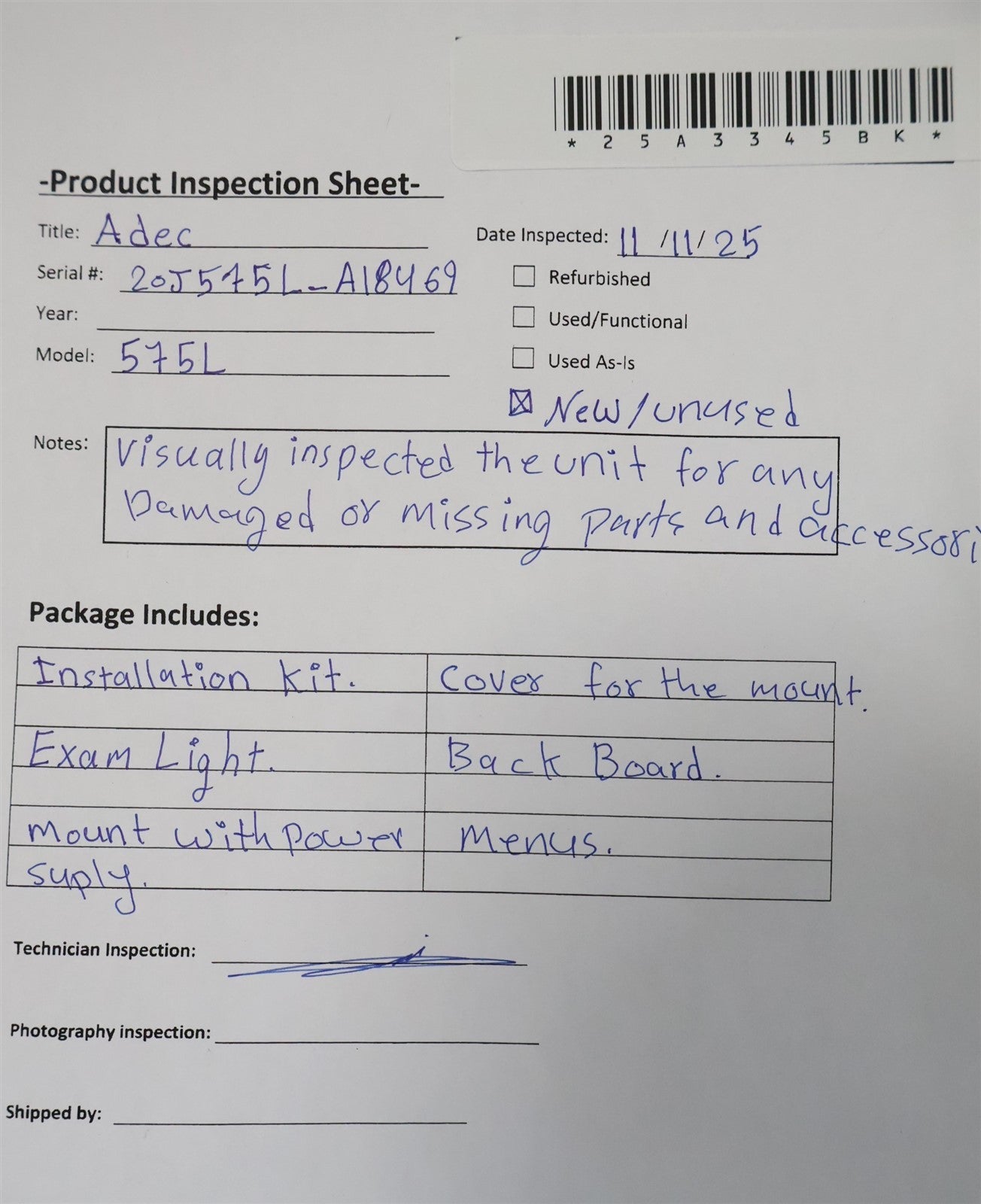 Visually inspected tyhe unit for any damaged or missing parts and accessories. the unit is New/ unused ZN