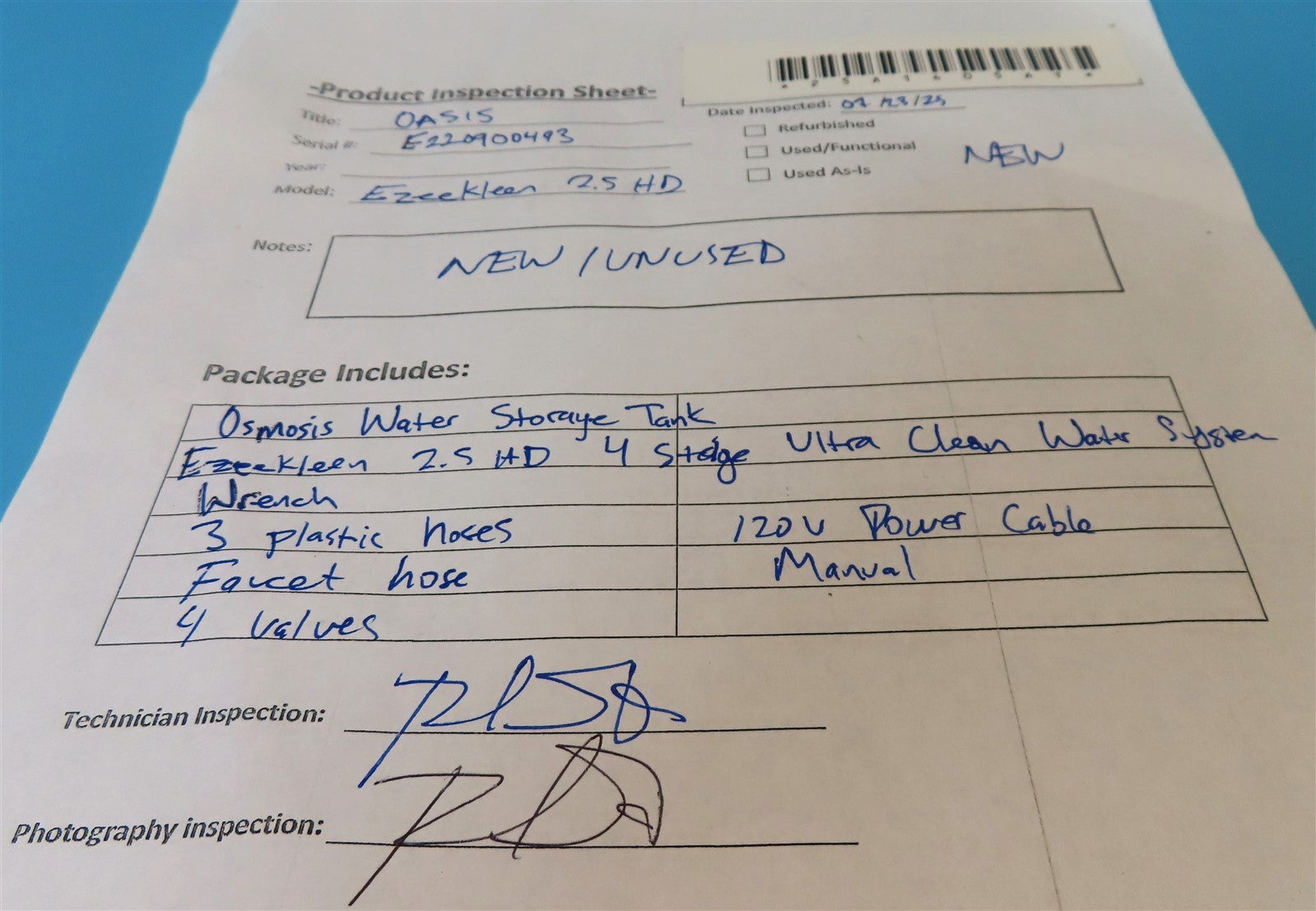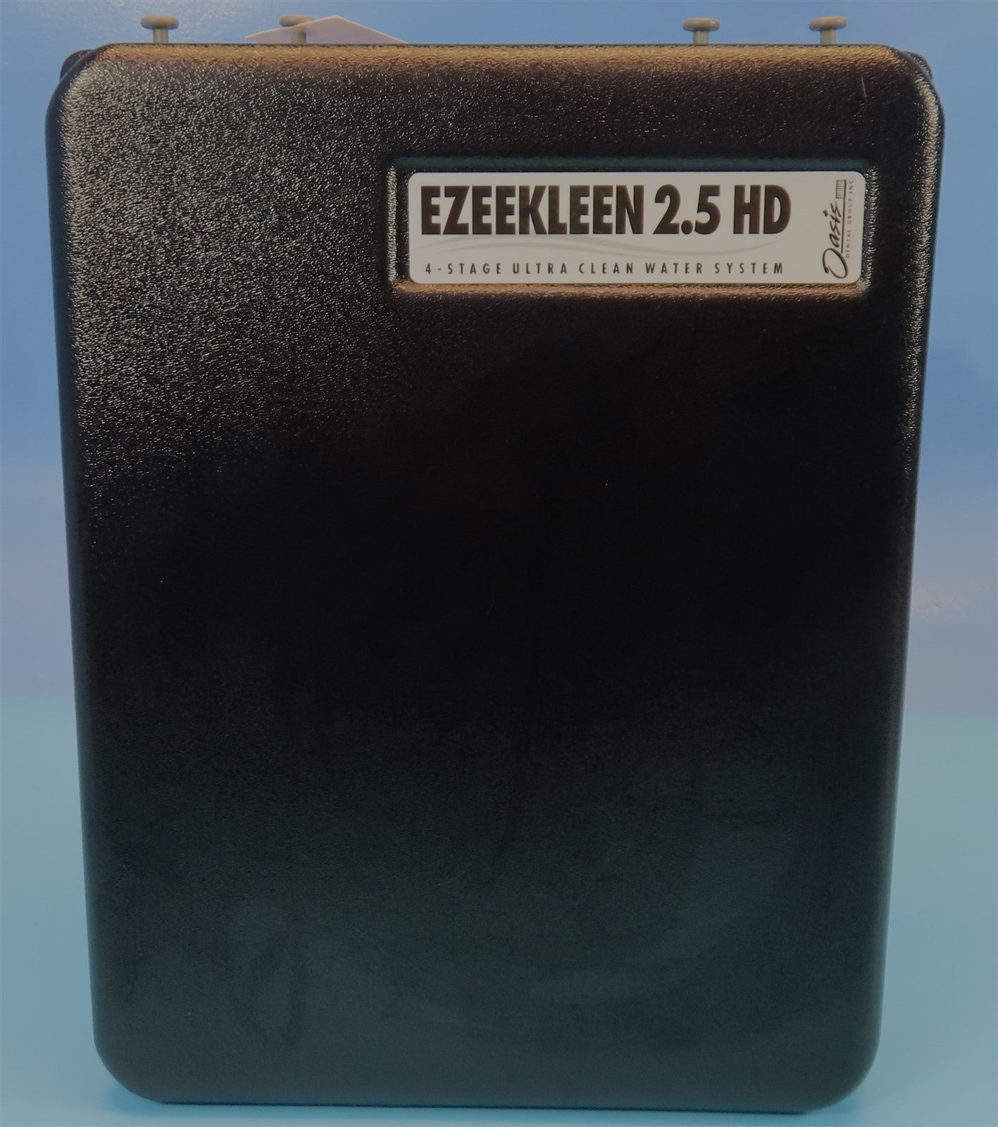 Oasis Water Storage Tank, Ezeekleen 2.5 HD 4 Stage Ultra Clean Water System, Wrench, Plastic Hose x3, Faucet Hose, 4 Valves, 120V Power Cable, Manual