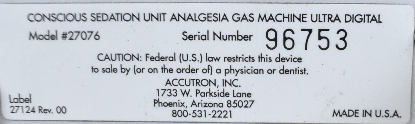 Accutron flush mount digital main module, Extra hoses, n20 hose, x2 o2 hoses, mixed gas out line (White), 3-foot corrugated tube, Chair mount assy. 120V power cord.