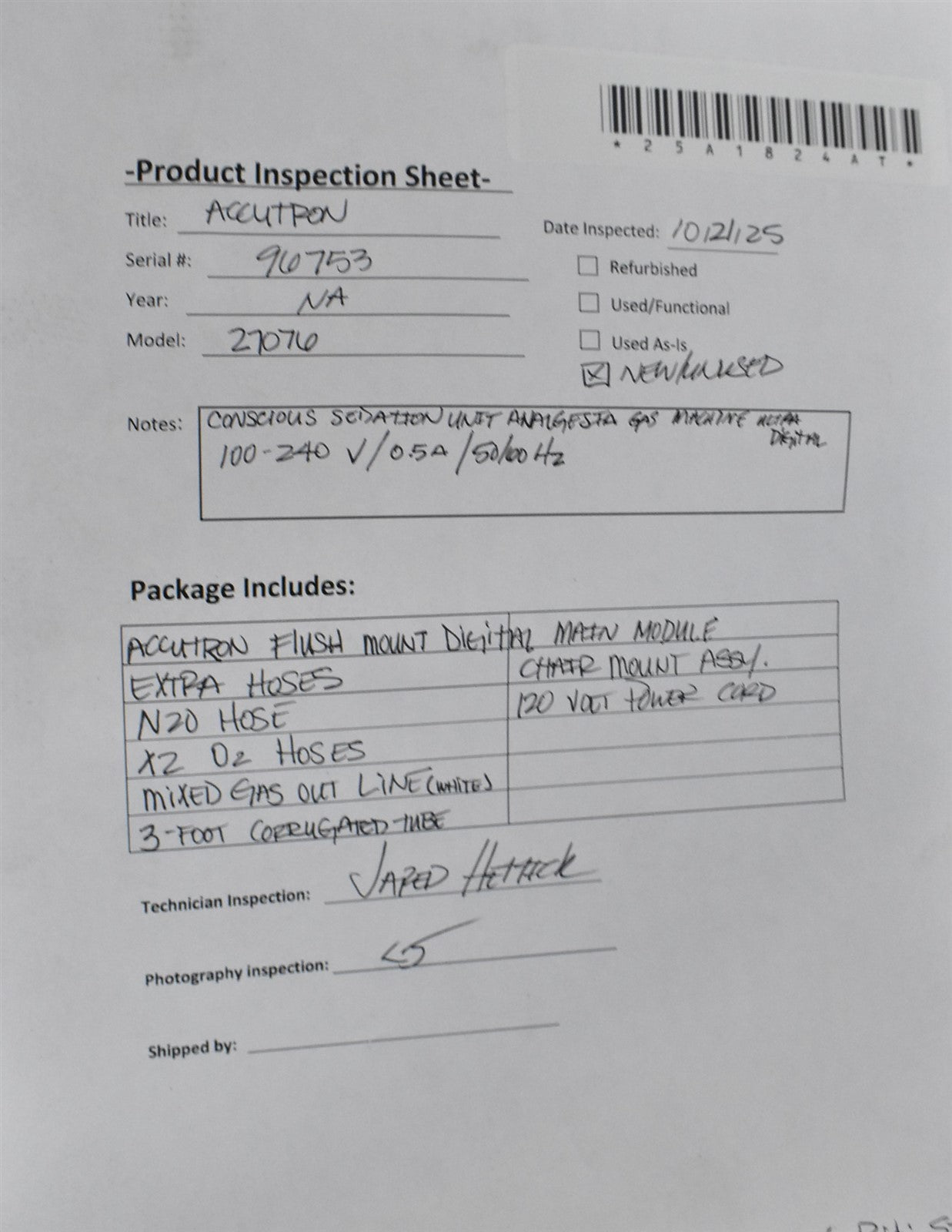 (10/22/2025) - Verified that all components are present, undamaged, and document condition without powering on unit (ST)