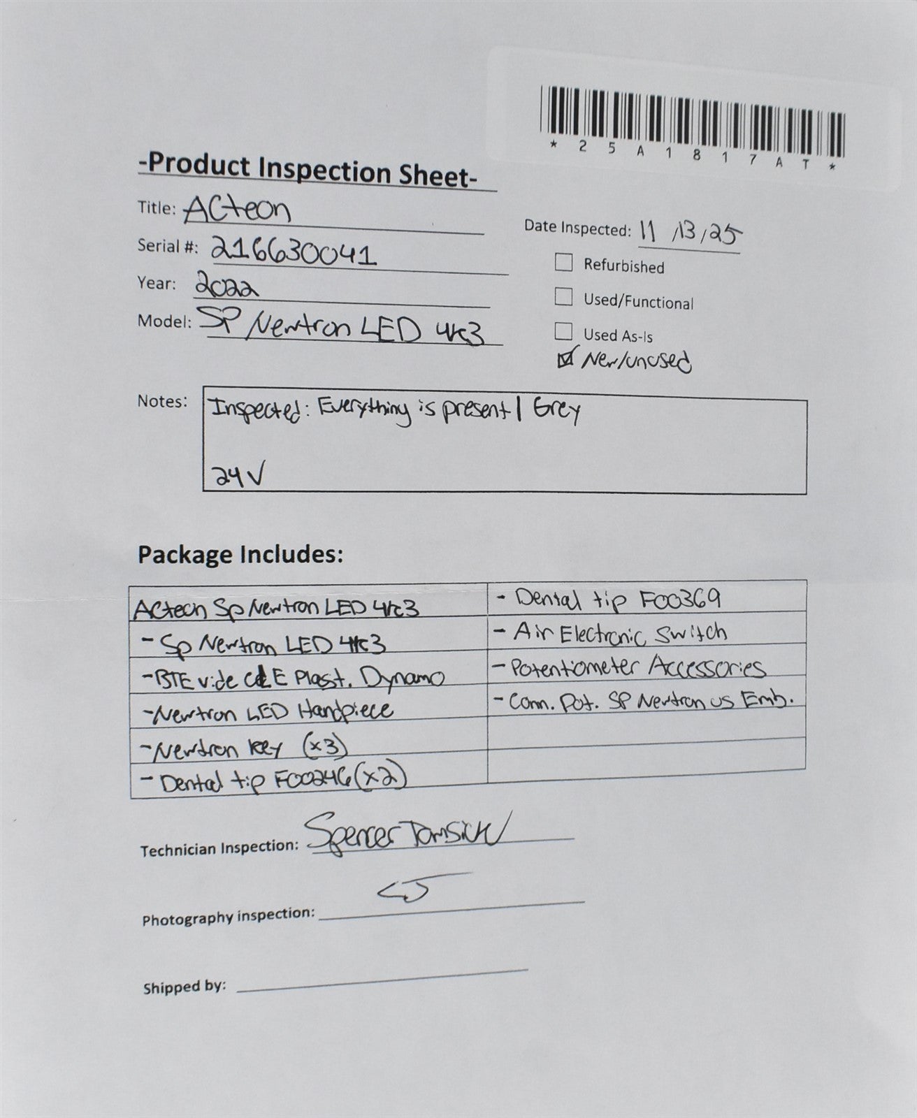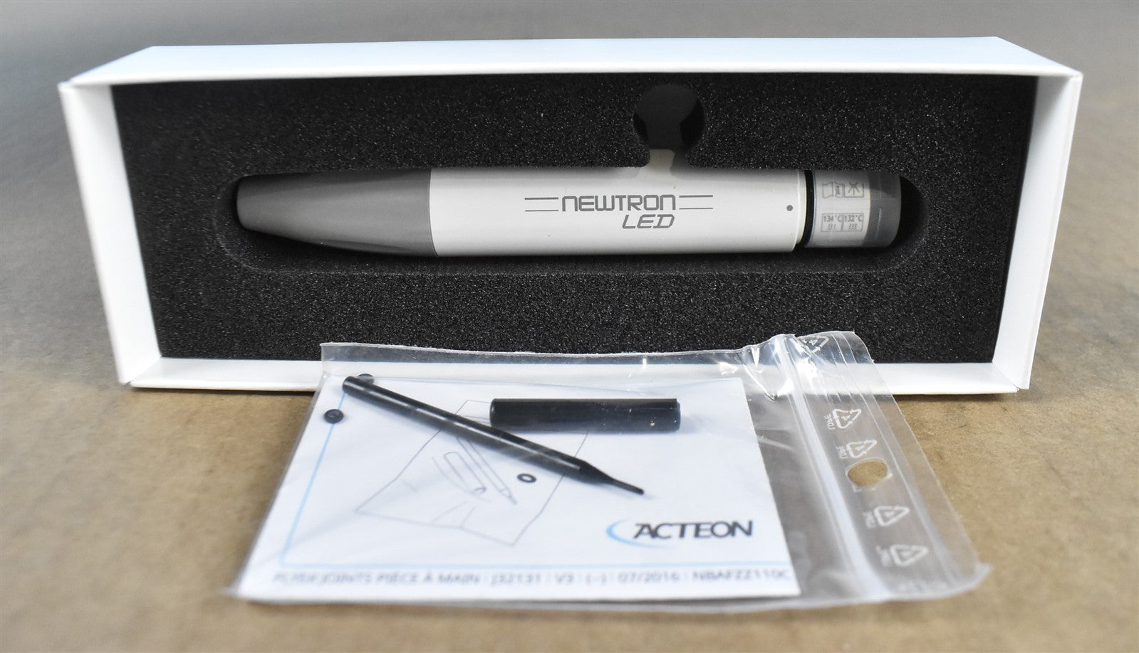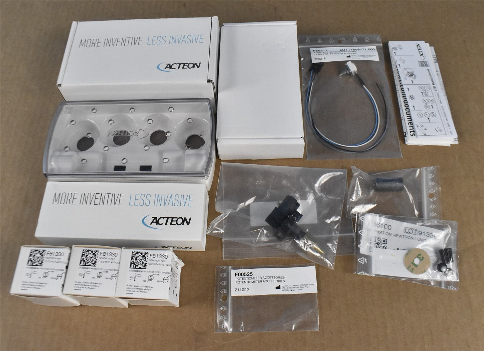 Acteon Sp Newton LED 4k3, Sp Newtron LED 4k3, BTE Vide CLE Plast. Dynamo, Newtron LED Handpiece, Newtron Key (x3), Dental Tip F000246 (x2), Dental Tip F00369, Air Electronic Switch, Potentiometer Accessories, Conn. Pot. SP Newtron Us Emb.