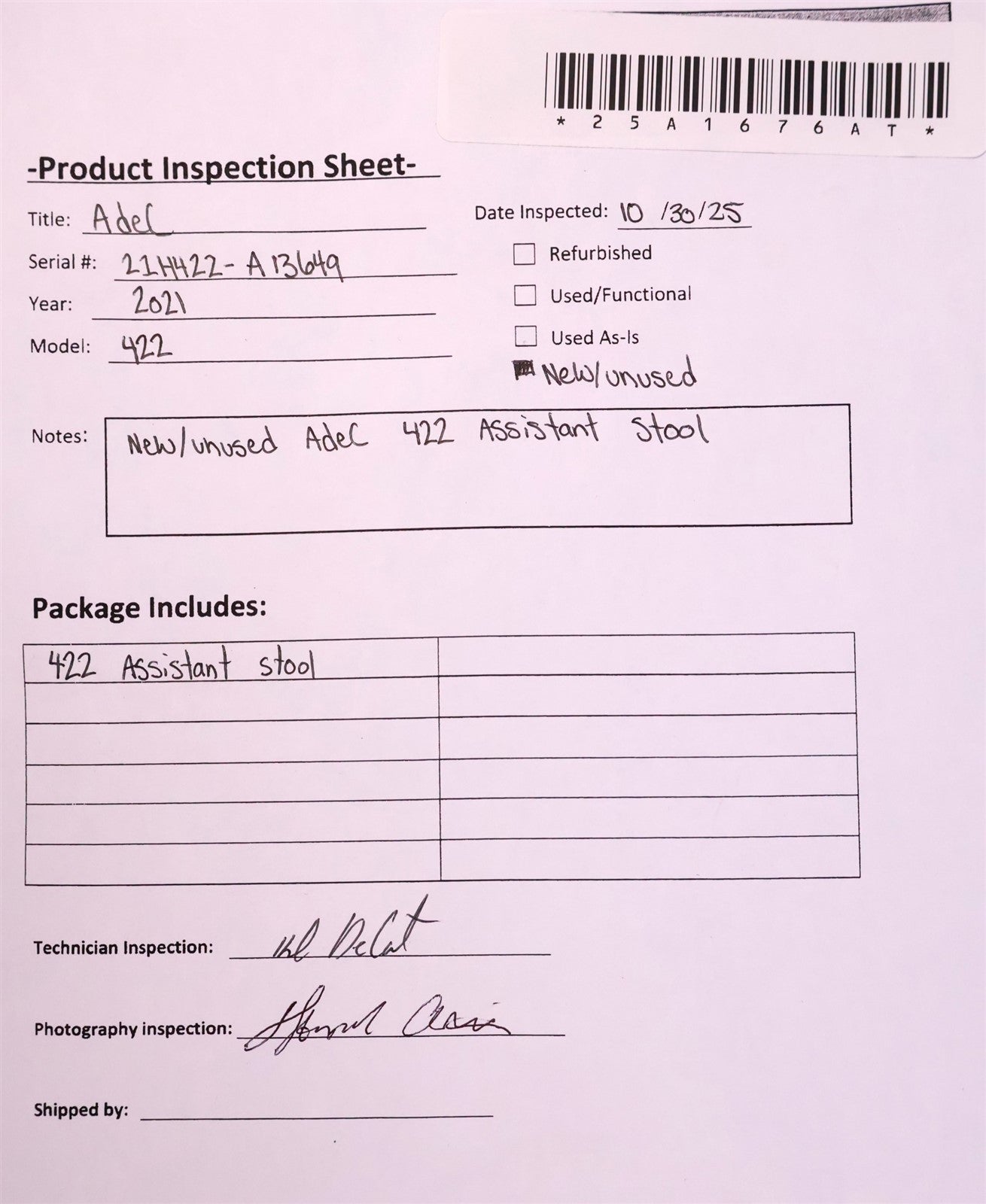 Your purchase will NOT include: - other accessories not shown or listed here.This item is a NEW/UNUSED Adec 422 Assistant stool. Visually inspected for any damage. DAMAGE FREE. COMPLETE. Light Gray Ultraleather upholstery.