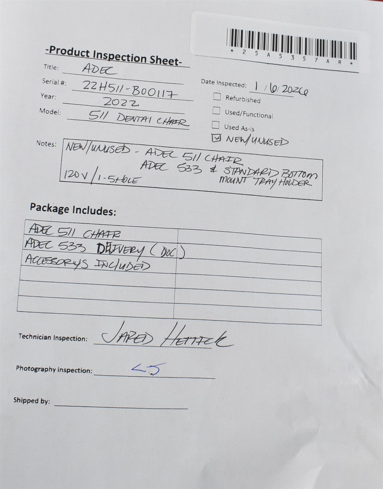 Adec 511 Dental Chair, Adec 533 Delivery, Accessories included.