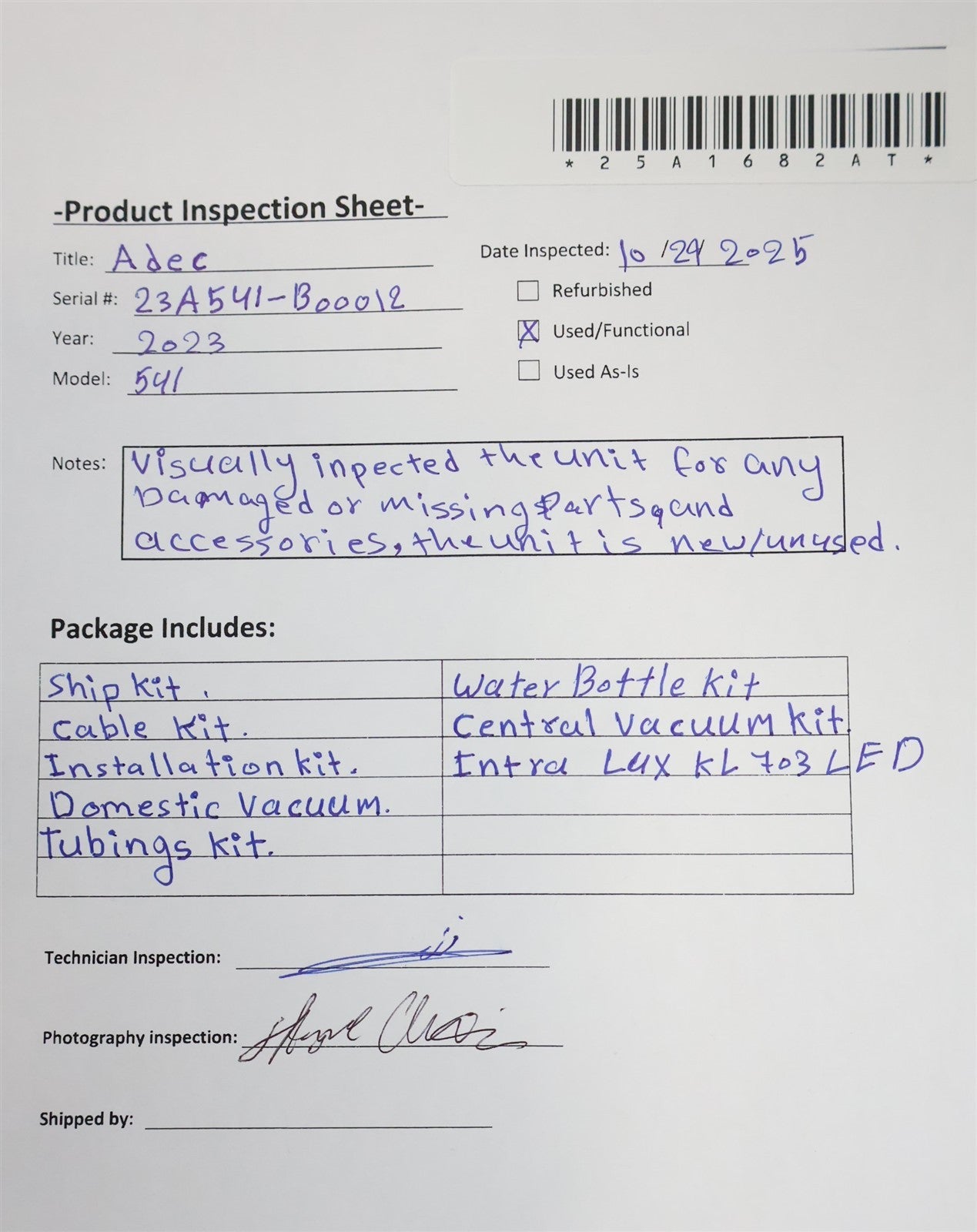 Ship kit, Cable kit, Installation kit, Domestic Vacuum Tubings Kit, Water Bottle kit, Central Vacuum Kit, Intra Lux KL 703 LED.