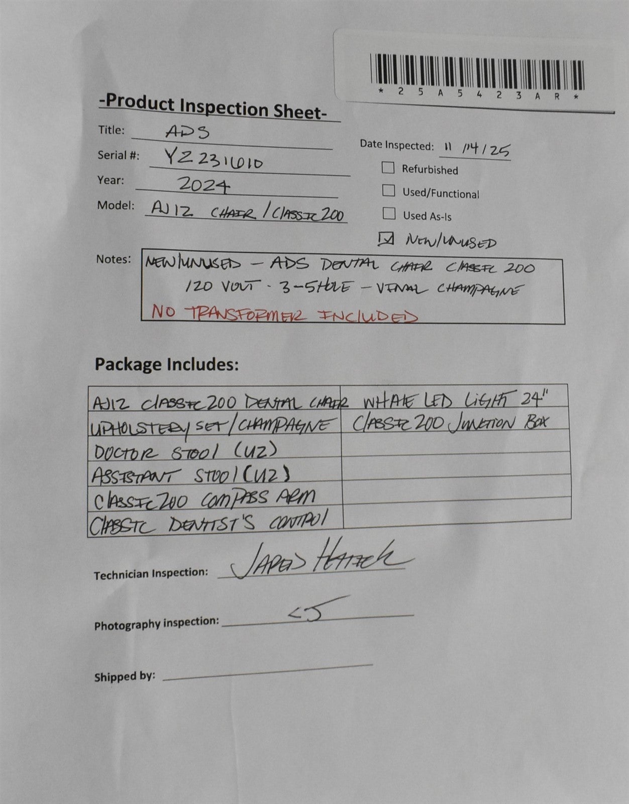 AJ12 Classic200 Dental chair, Upholstery set/Champagne, Doctor stool , Assistant stool, Classic200 compass arm, Classic dentist control, Whale LED light 24", Classic junction box.