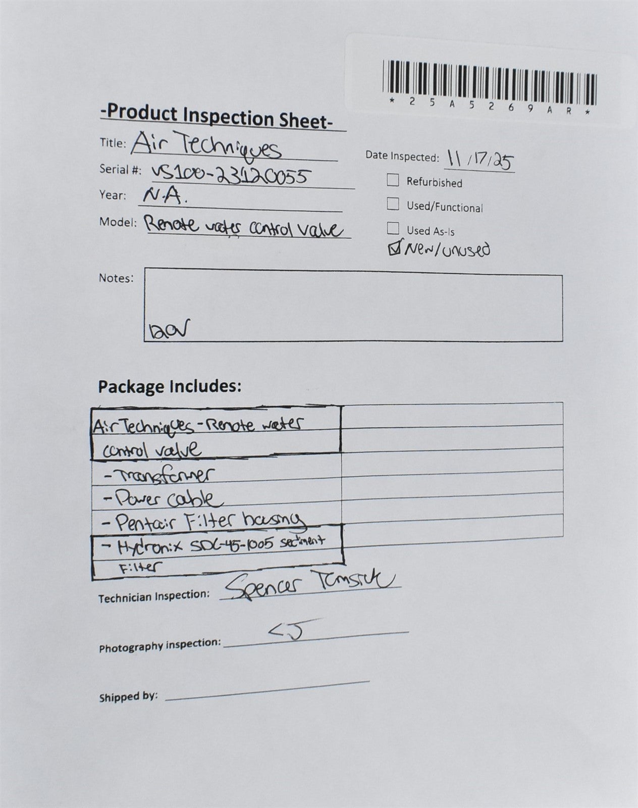 Air Techniques - Remote Water Control Valve, Transformer, Power Cable, Pentair Filter Housing, Hydronix SDC-45-1005 sediment Filter