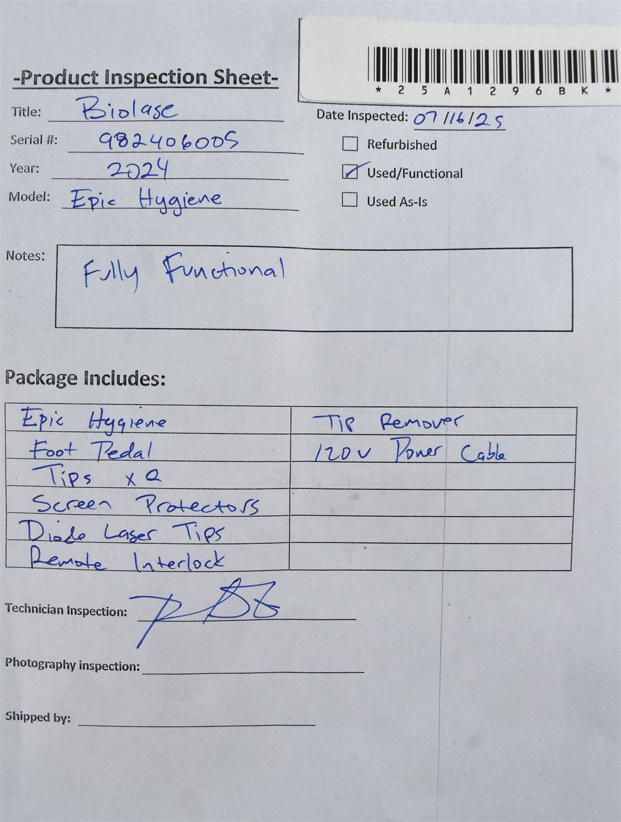 Epic Hygiene, Foot Pedal, Tips x2, Screen Protectors, Diode Laser Tips, Remote Interlock, Tip Remover, 120V Power Cable