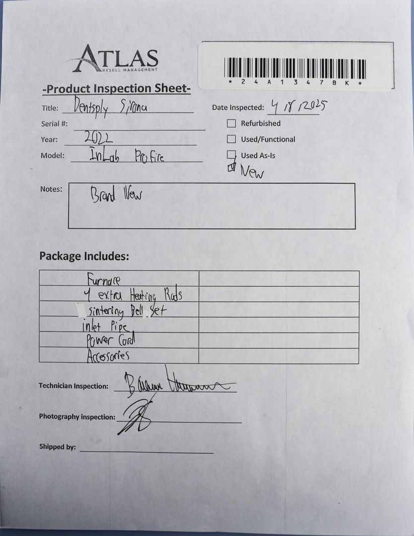The Dentsply Sirona INLAB PROFIRE is brand new, so it was inspected for damage or missing parts. Inspection Result: Passed - Ready for Resale