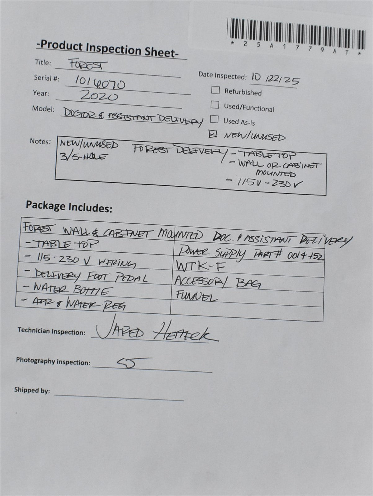 Forest Wall & Cabinet mounted DOC. & Assistant Delivery, Table Top, 115-230V wiring, Delivery Foot Pedal, Water Bottle, Air & Water Reg, Power Supply part# 0014152, WTK-F Accessory Bag, Funnel
