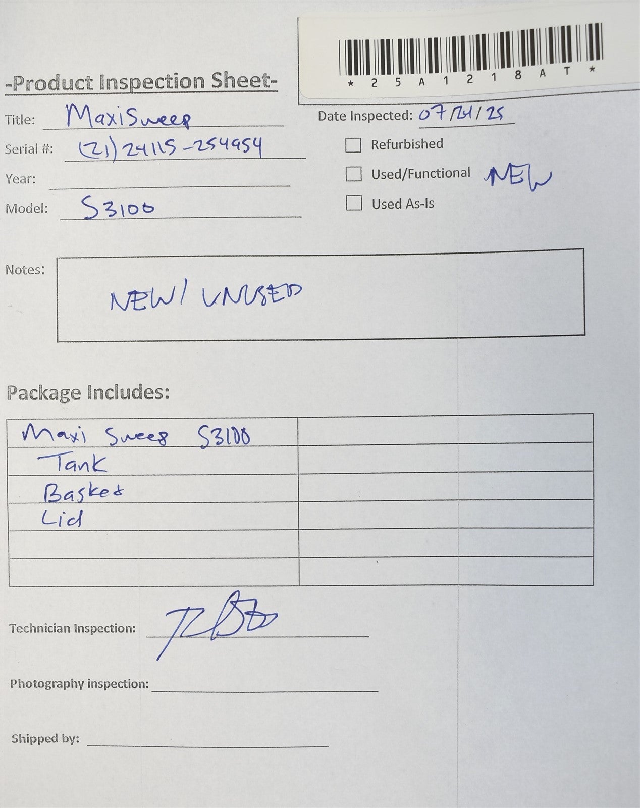 Visually inspected the unit for any damages or missing parts and accessories. This unit is new/unused