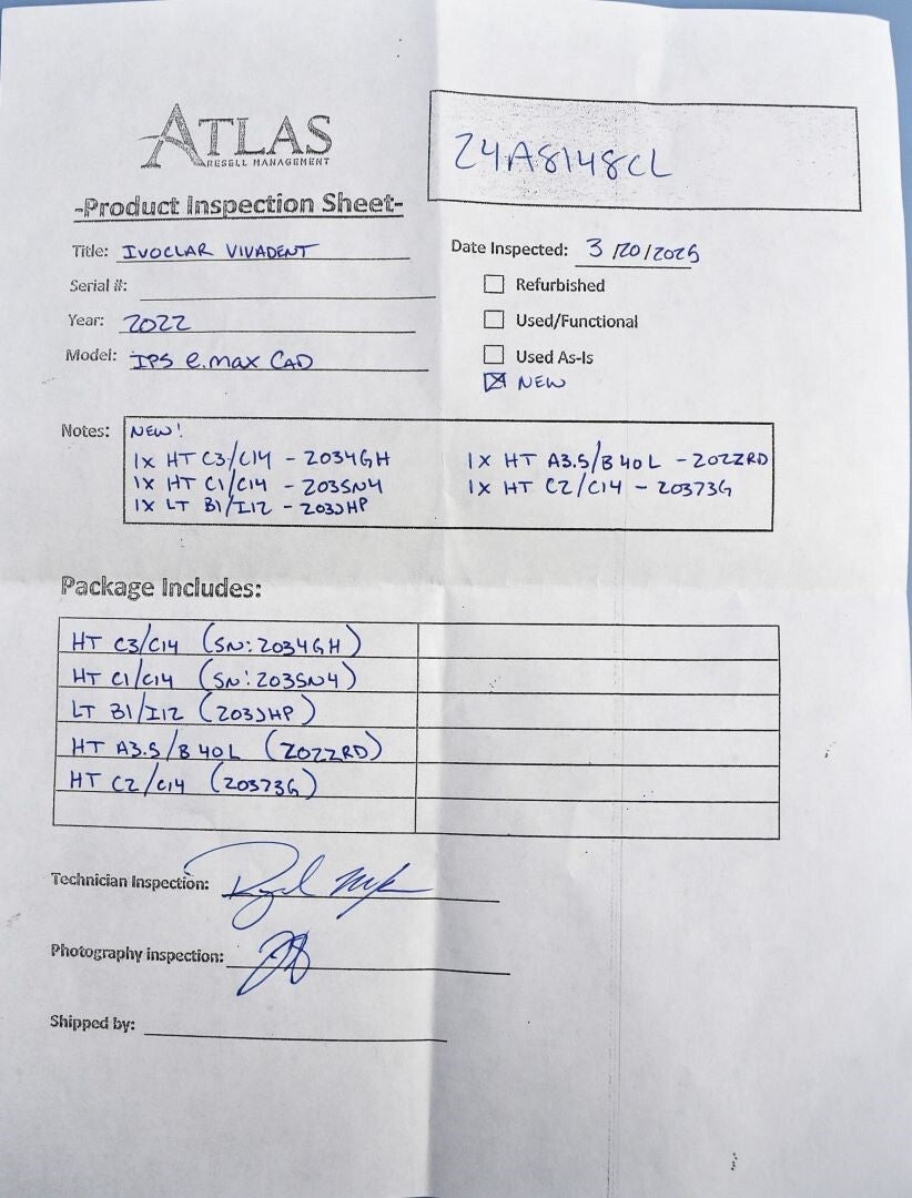 Atlas Resell Management has more experience testing and shipping CEREC and other CAD/CAM units than anyone else on eBay. Just check out the wide selection of CAD/CAM units in our store.We're proud to be the most trusted source for quality used CAD/CAM units in the pre-owned dental equipment market. Your purchase will NOT include: - other accessories not shown or listed here.Visually inspected the milling blocks for any damaged or missing pieces. All the blocks are new/unused.
